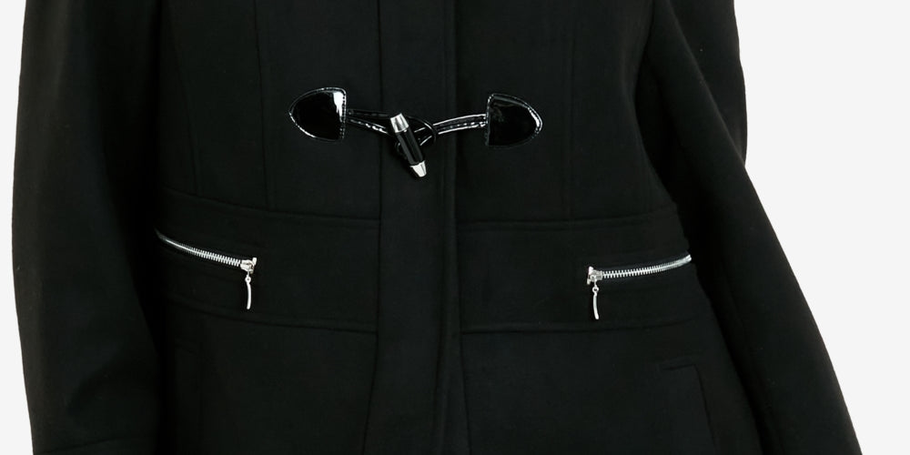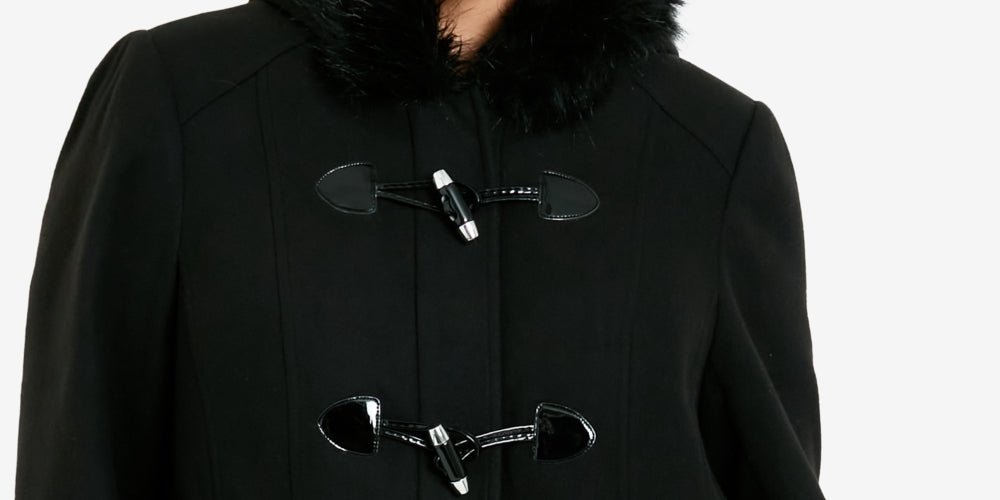 This duffle jacket is as comfortable as it is versatile| You'll love the plush trim hoodie| toggle overlay button design and below hip hemline