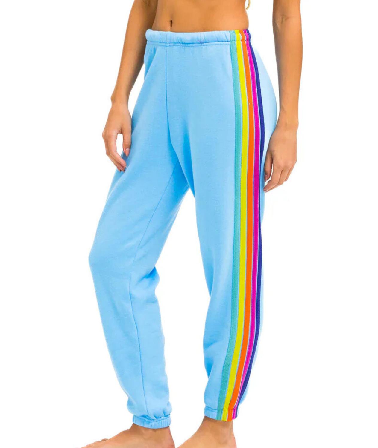 The perfect pant for running around town and looking cool while doing it. Introducing the Aviator Nation 5 Stripe Sweatpants—where style meets comfort. Made from polyester, these women's streetwear essentials feature a trendy striped pattern and a relaxed fit perfect for casual or lounging days. With a pull-on closure and tapered leg style, these U.S.-crafted track pants offer effortless wear. Care is easy with machine wash and line dry instructions, ensuring they remain as stylish as ever. 50% polyester, 38% cotton, 12% rayon.