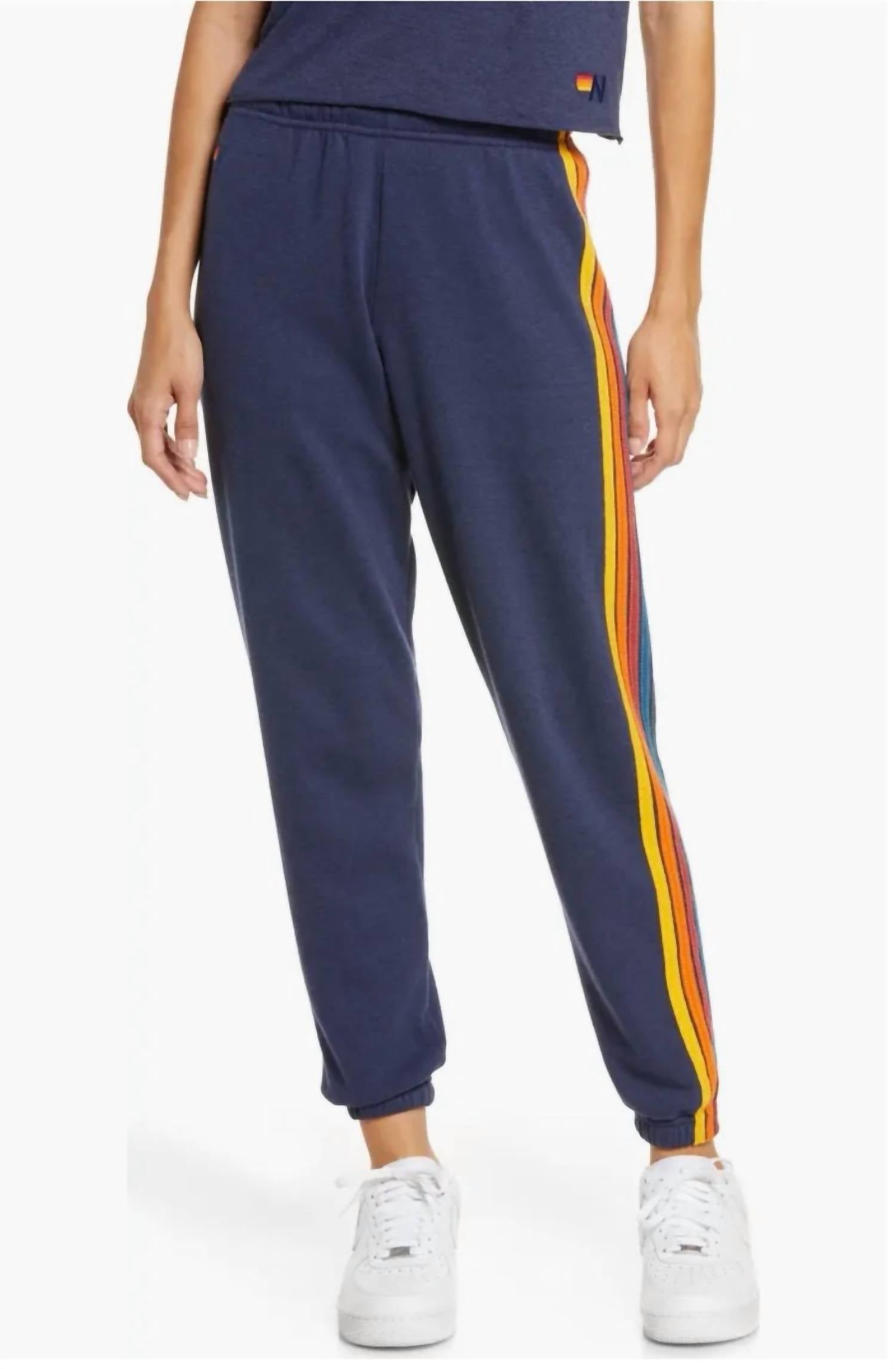 No gym necessary for these cool-girl joggers. Introducing the 5 Stripe Sweatpants by Aviator Nation, a stylish and comfortable choice in navy featuring unique 5 stripe detailing down the legs. These sweatpants come in a mid-rise, relaxed-fit with a straight leg style for ultimate comfort. Composition: 50% Polyester, 38% Cotton, 12% Rayon. Crafted with pride in Los Angeles, these sweatpants offer a pull-on closure and ensure lasting comfort with a broken-in vintage feel. Care instructions: Machine wash cold with like colors, hang or tumble dry on low.