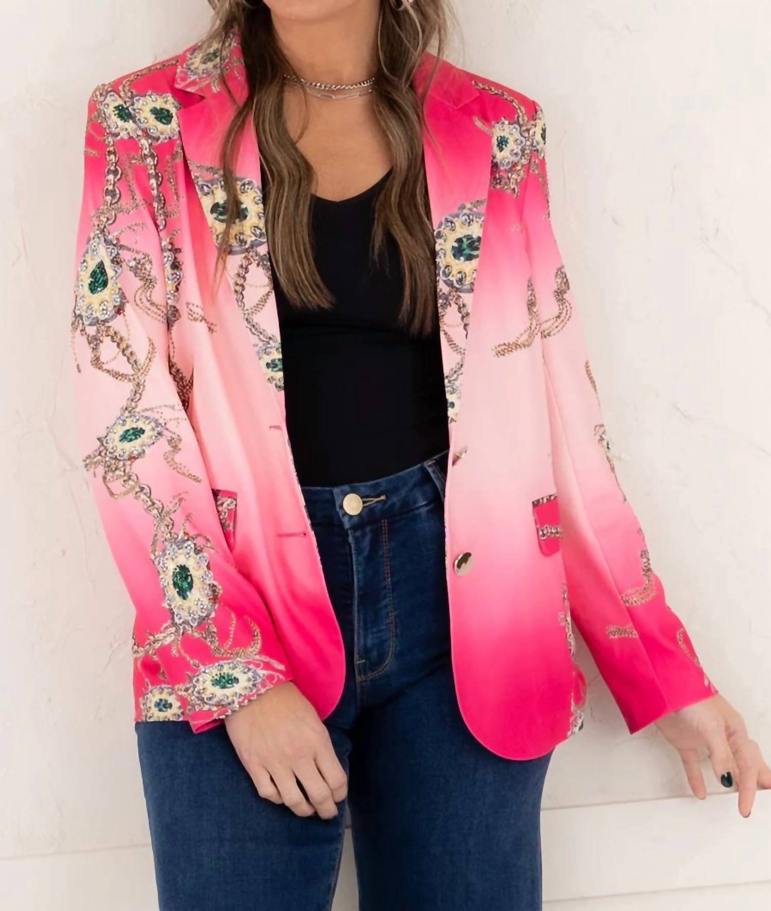 A blazer so versatile you can wear it to the office or pair it with jeans for a more casual look. Sparkling addition perfect for those glamorous evening events. Women's long sleeve blazer in Pink Multi showcases rhinestone accents and an abstract pattern on luxurious satin fabric, offering a trendy Y2K vibe. Composed of 95% Polyester and 5% Spandex. Features a comfortable satin lining, button closure, and a collar neckline for a tailored look. For best care, dry clean only.