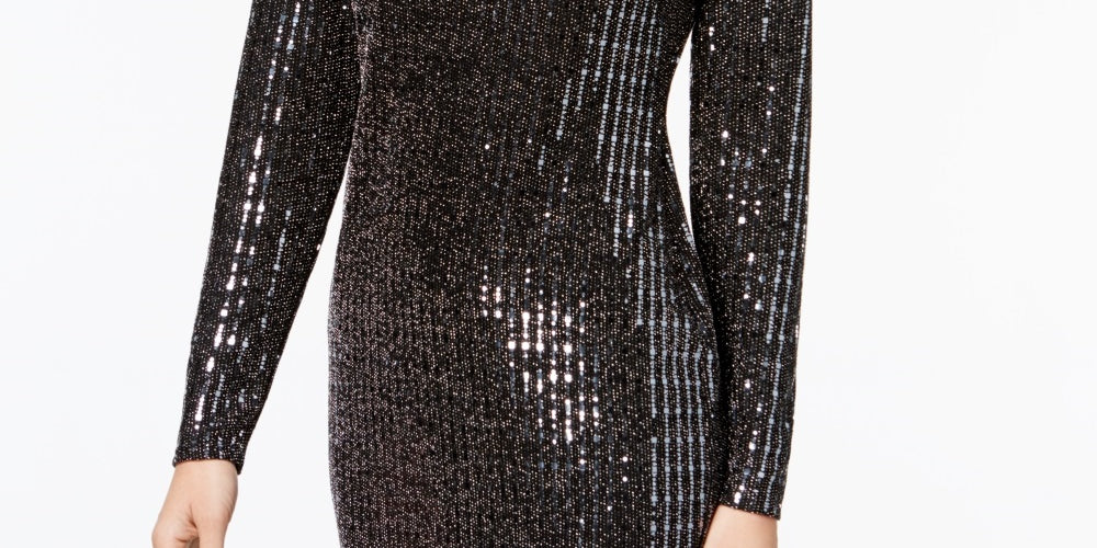 Scoop neckline|Pullover style; no closures|Allover metallic disco-dot sequin embellishments|Bodycon silhouette|Unlined|Rounded shirttail hem