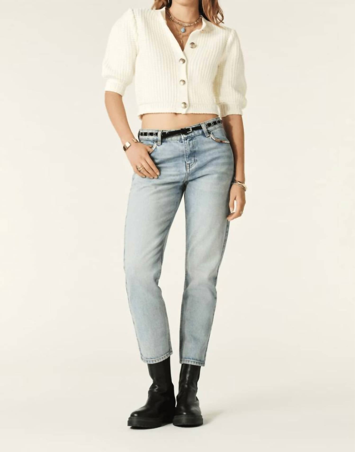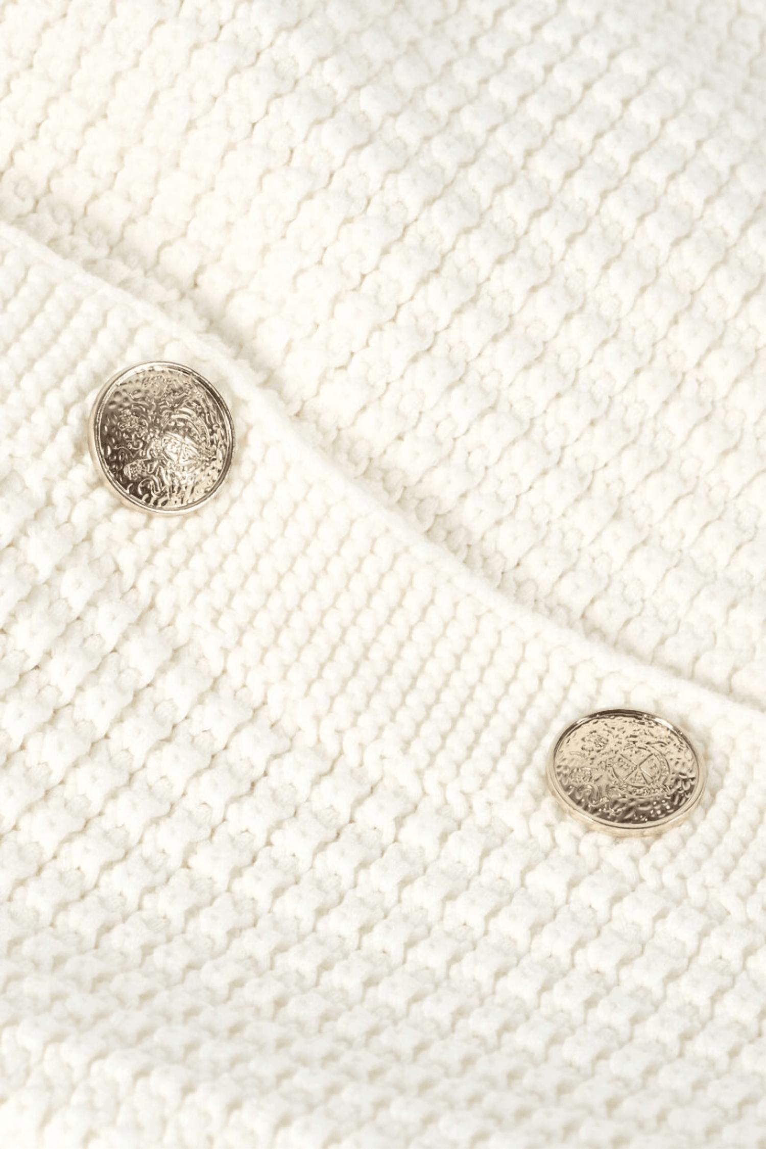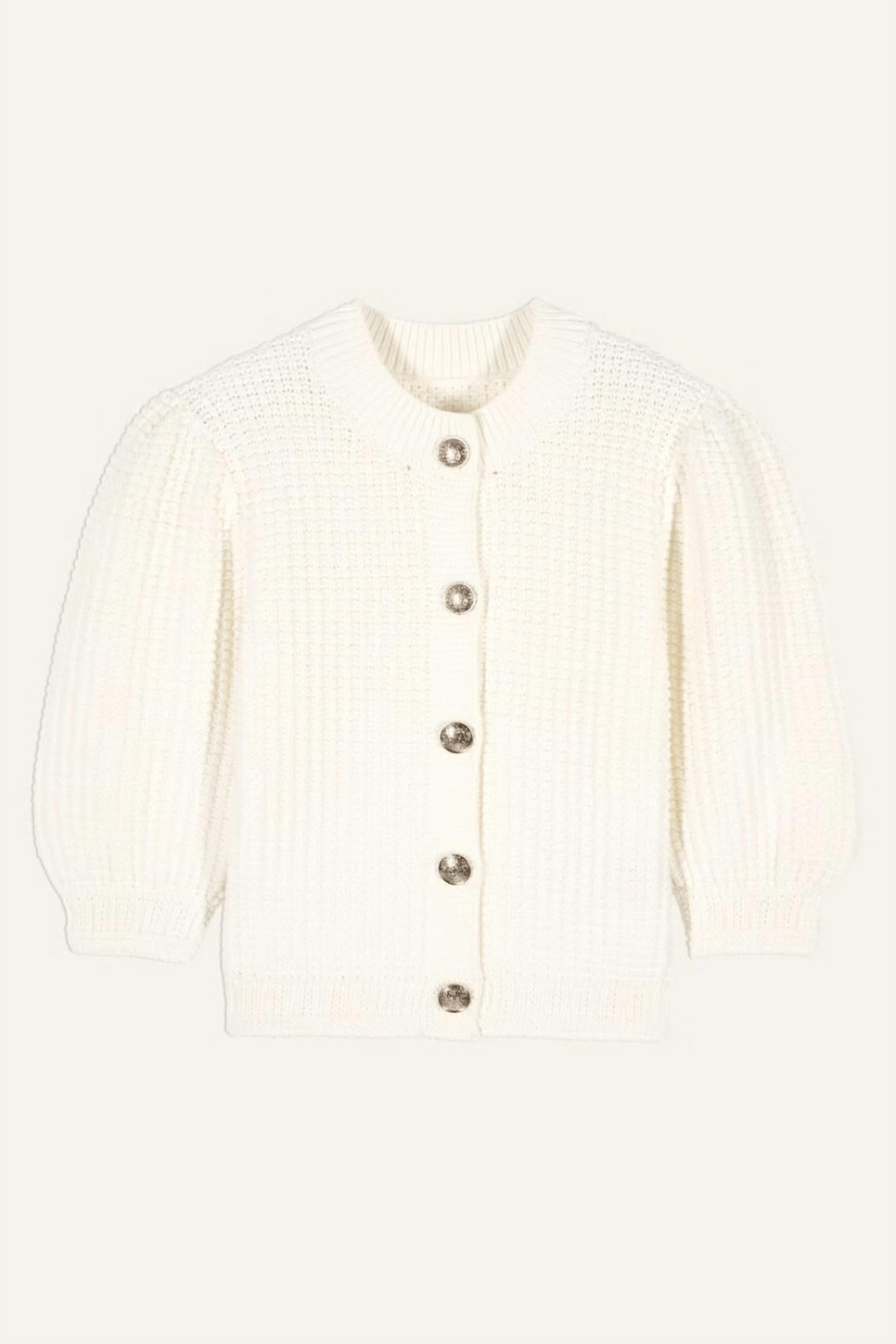 A classic fit that works just as good buttoned as it does left open. Elevate your spring wardrobe with the Garance Puffed Sleeves Cardigan by ba&sh, showcasing a minimalist design in ecru. This women's cardigan features long puffed sleeves, a straight cut, and is crafted from organic cotton for an eco-friendly touch. It is adorned with golden metal buttons and a textured graphic print for subtle elegance, complemented by a crewneck and ribbed trim. Closure is achieved with button closure, and it's conveniently machine washable, making it a stylish yet practical choice for dinner parties or Easter gatherings.