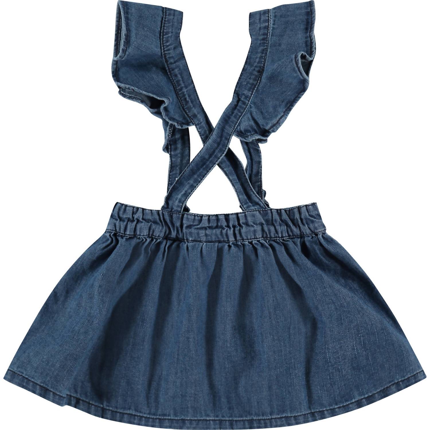 Introducing the Girl's Denim Suspender Skirt by babyface, a playful and stylish piece to elevate any wardrobe. This textured pinafore-style skirt in a medium wash, mid-blue denim features an elastic waistband and adjustable suspender straps with ruffle detail. Made from 100% cotton, it hits just above the knee for a comfortable, breathable fit. Care: Machine wash cold separately, do not bleach, lay flat to dry, medium iron, do not dry clean. Perfect for a streetwear look this spring, ideal for vacations or Thanksgiving occasions.