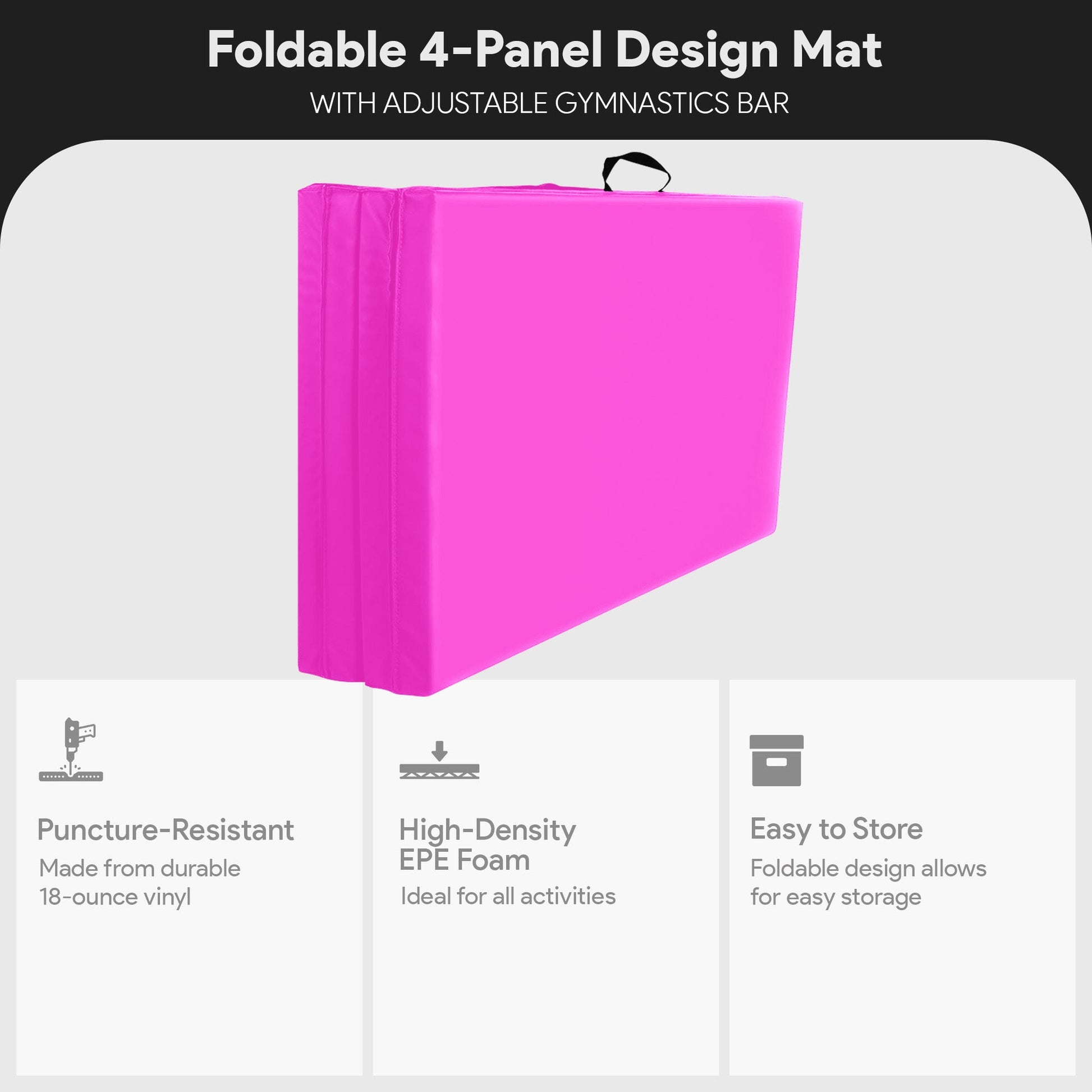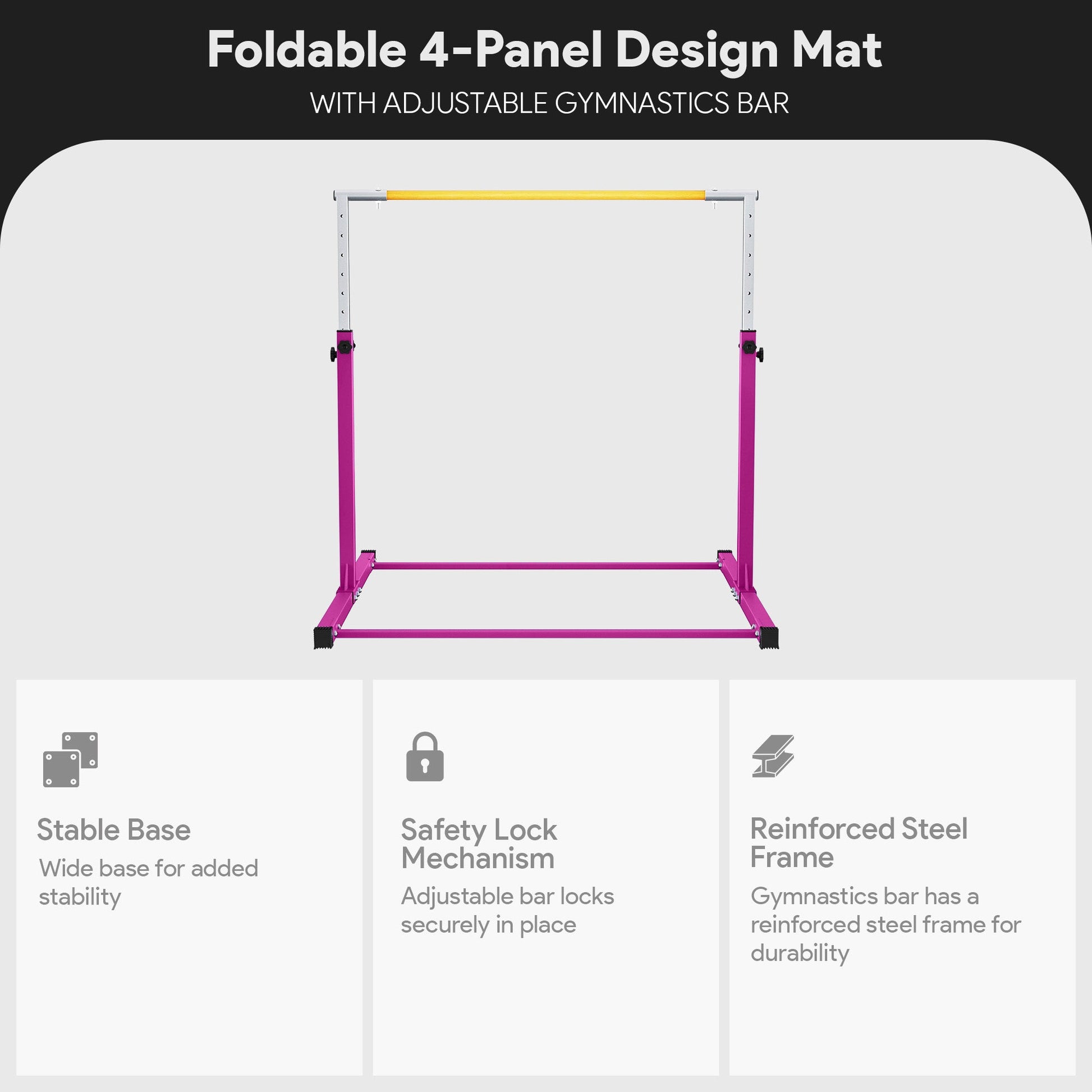 - Long 120 by 48-inch gymnastics mat and adjustable gymnastics bar, perfect for yoga, aerobics, pilates, martial arts, and gymnastics training