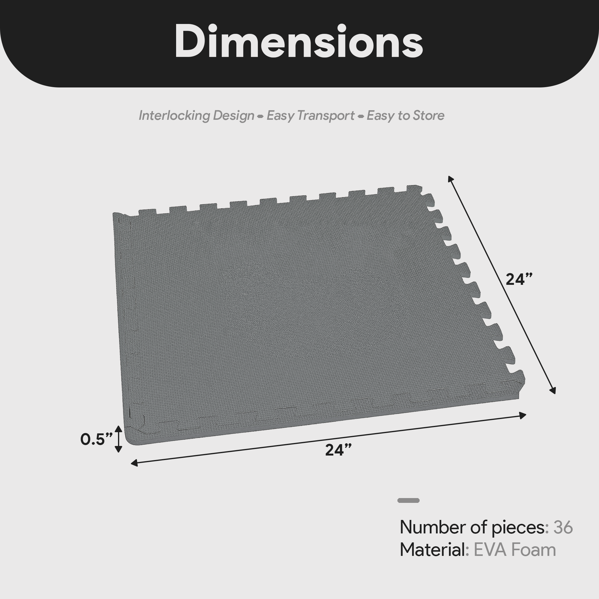 - Tile dimensions (L x W x H): 24 x 24 x 0.5 inches