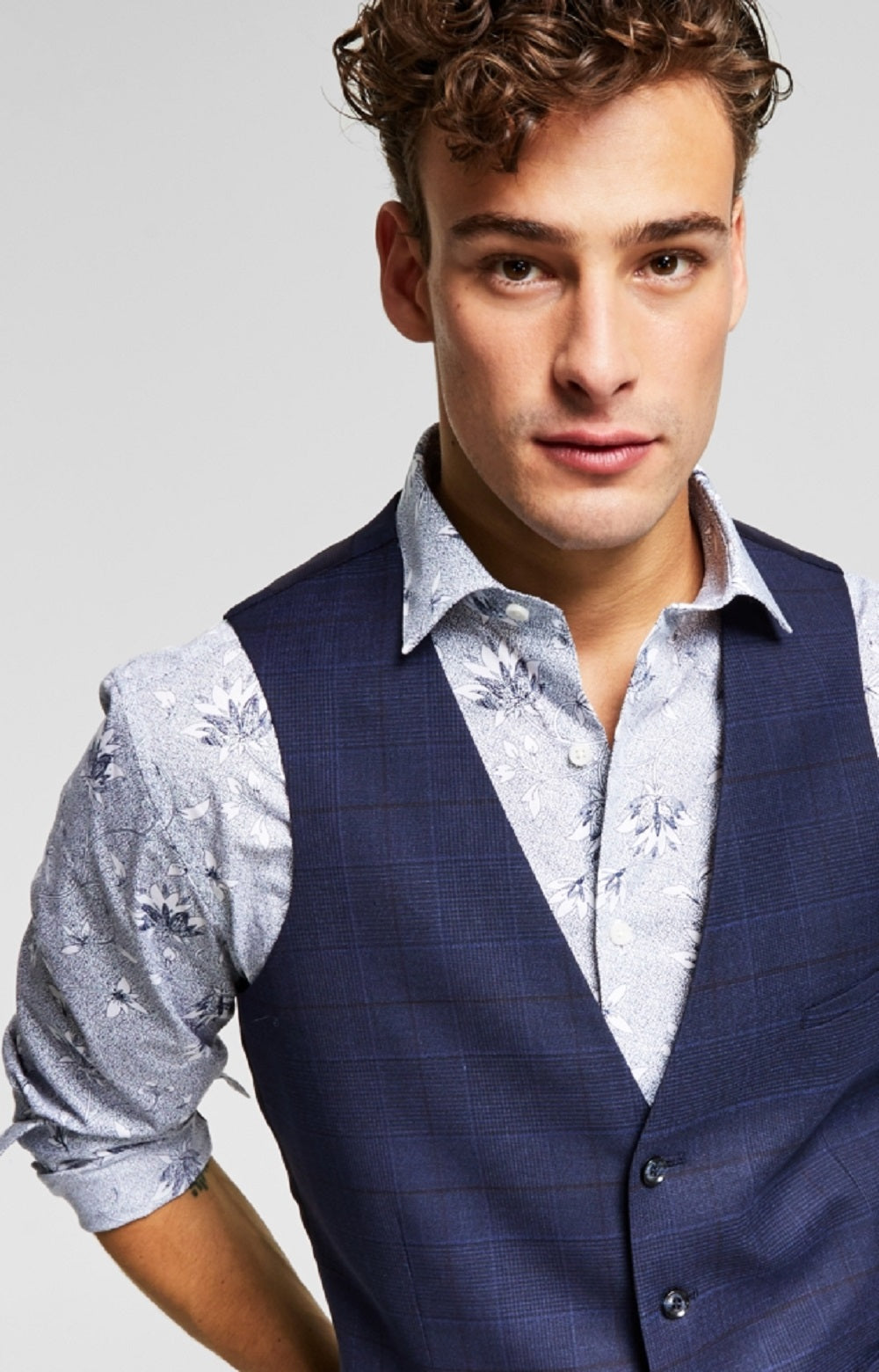 Adjustable half-back belt; lined|Imported|Two front welt pockets; left chest welt pocket|Matching jacket and pants sold separately|No lapel|Four-button closure