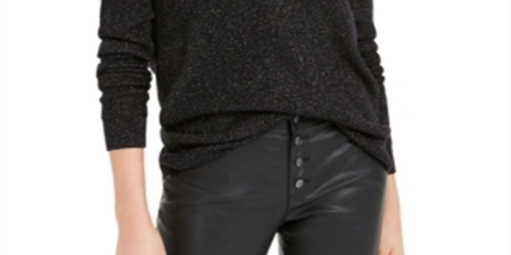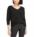 Bar III Women's Gathered Glitter Long Sleeve V Neck Top Black Size X-Small
