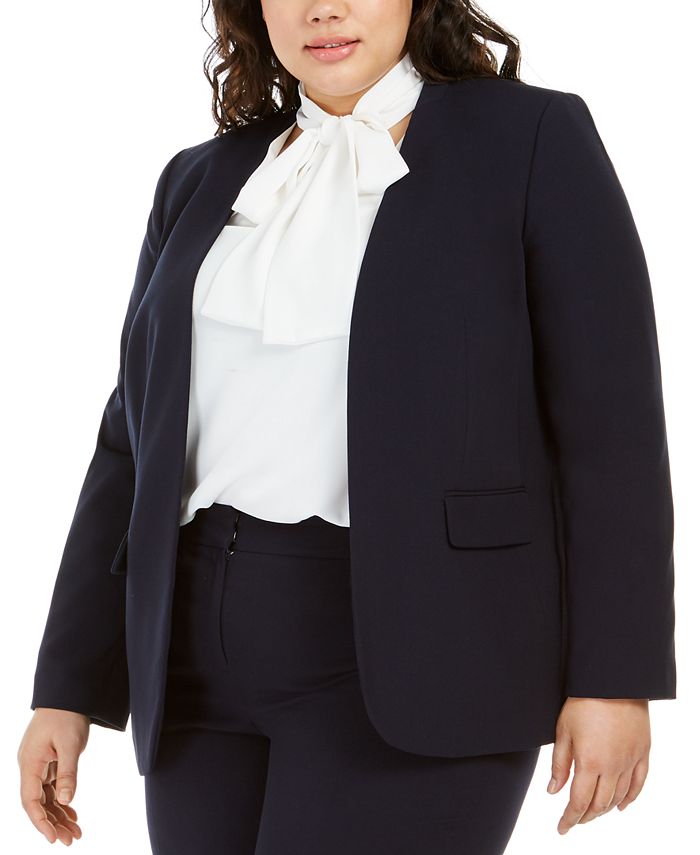 Fuss-free lines and an open silhouette flatter on this smart plus size blazer by Bar III. Shoulder pads structure the look for office-ready style.| Open neckline and front; no closure| Lined| Shoulder pads| Imported| | Pocket flaps at front