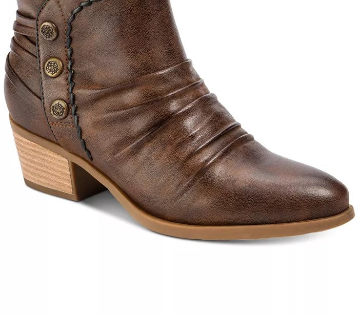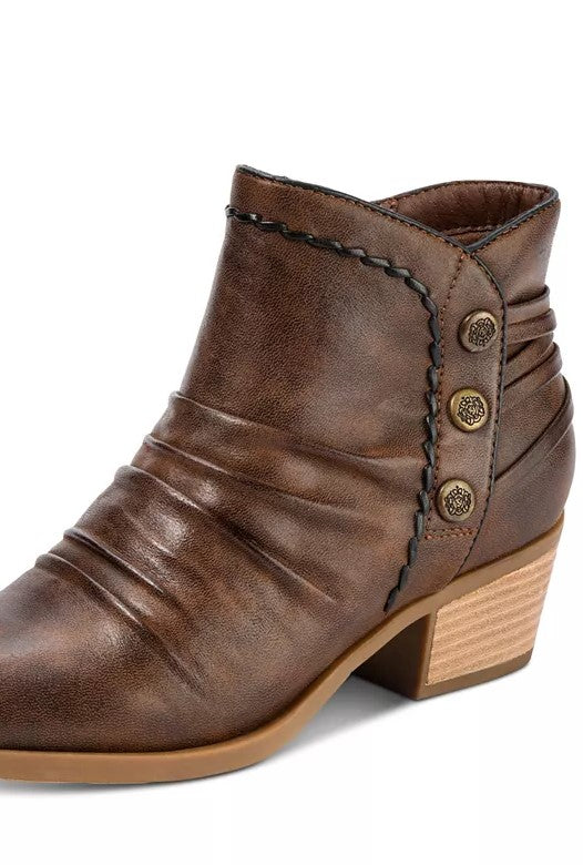 2" heel|Almond-toe booties with side zipper closure|Ruched vamp; button detail at side; piping and whipstitch trim; strappy lacing at back|comfort technology|fiber upper, Manmade lining, TPR outsole.|Imported