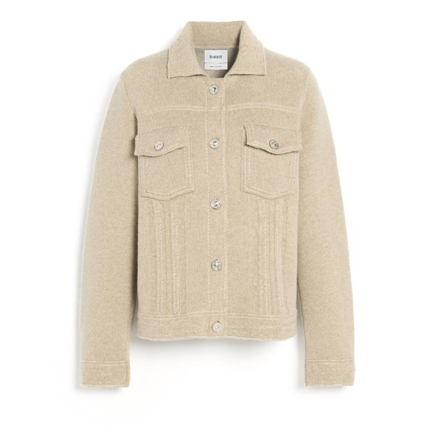 A jacket so versatile you can literally wear it with anything. Discover the exquisite craftsmanship of the Patchwork Regular Jacket by Barrie, expertly crafted in the United Kingdom. This women's cotton blend jacket features long sleeves and a classic front button closure, beautifully highlighted with a patchwork design in shades of urchin and sand. Designed for the minimalist at heart, it boasts two chest flap pockets for added practicality and style. With a composition of 65% cashmere and 35% cotton, it requires hand washing to maintain its luxurious feel. The model is 1.78m tall and wears a size S, and this jacket is a perfect addition for your travel wardrobe.