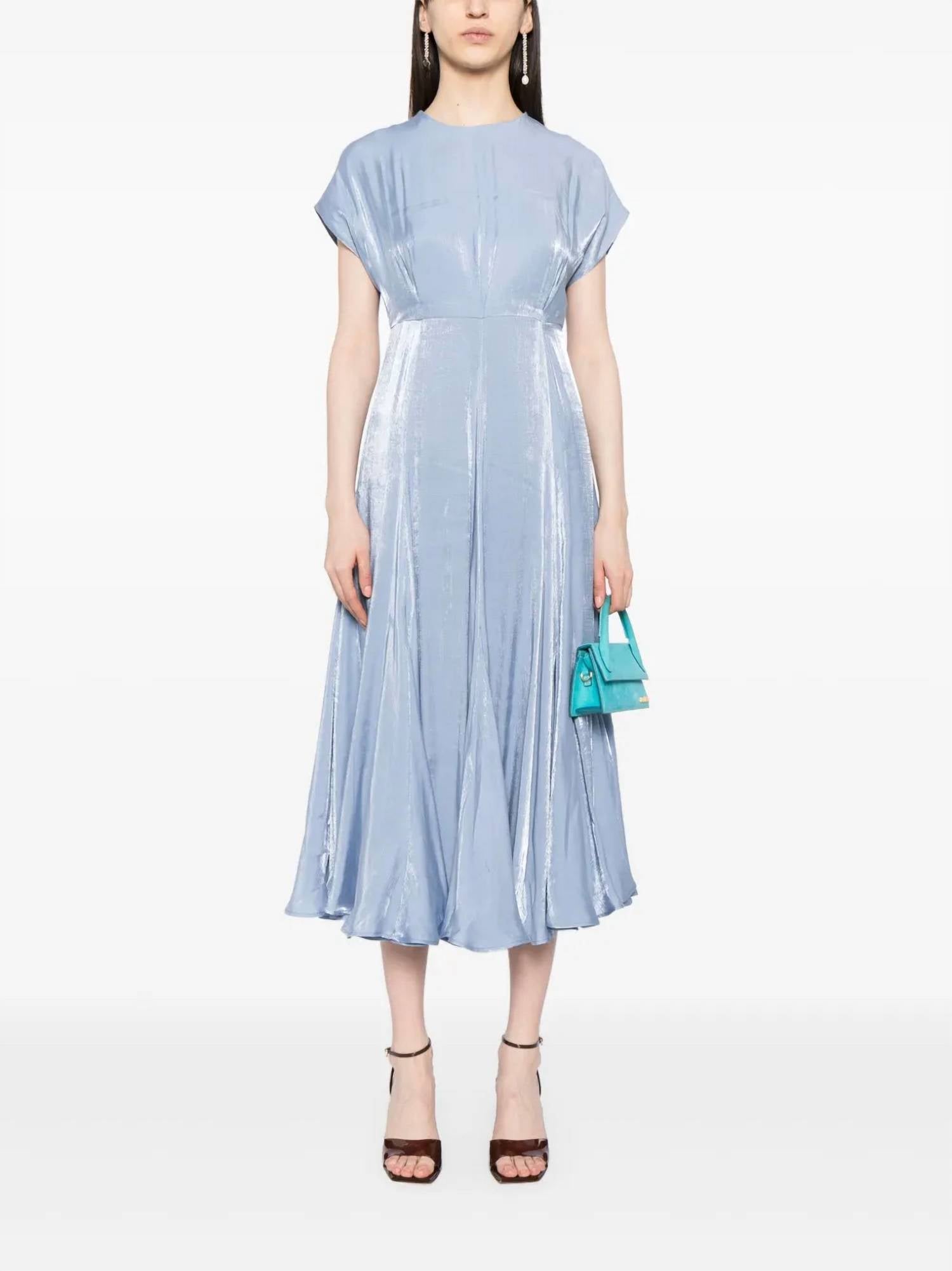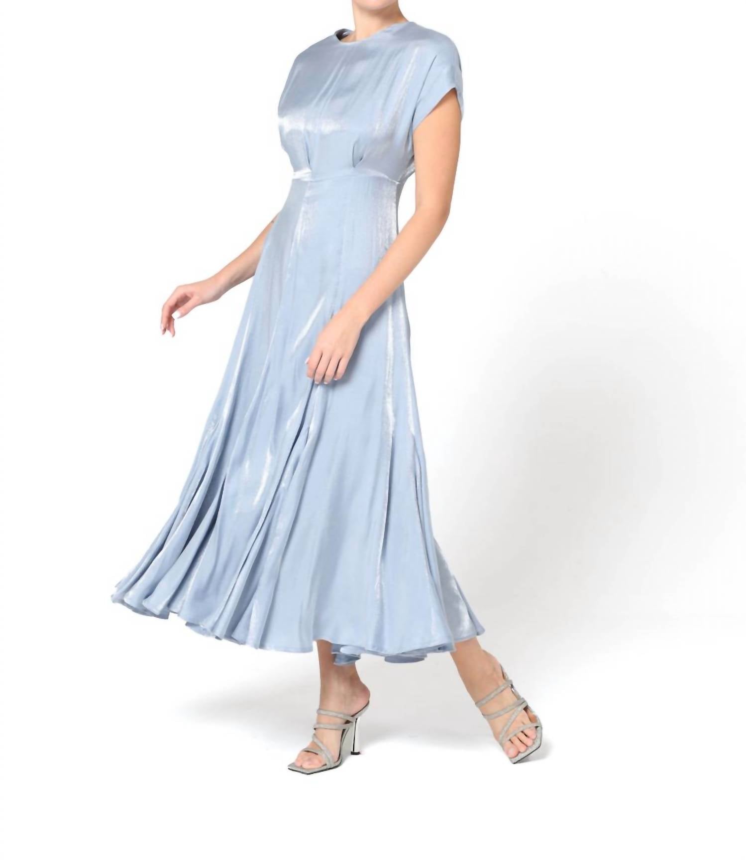 Enhance your wardrobe with the Baruni Aimee Foiled-finish Midi Dress in sky blue, a standout piece for any occasion. This short-sleeve A-line dress is crafted from a cotton fabric that flaunts a dazzling shimmer, making it a must-have for evening events. The dress features a chic mockneck and an elegant open keyhole detail at the back, secured with a discreet zip closure for a seamless silhouette. Delight in the luxurious feel of the soft rayon lining, ensuring comfort while turning heads.
