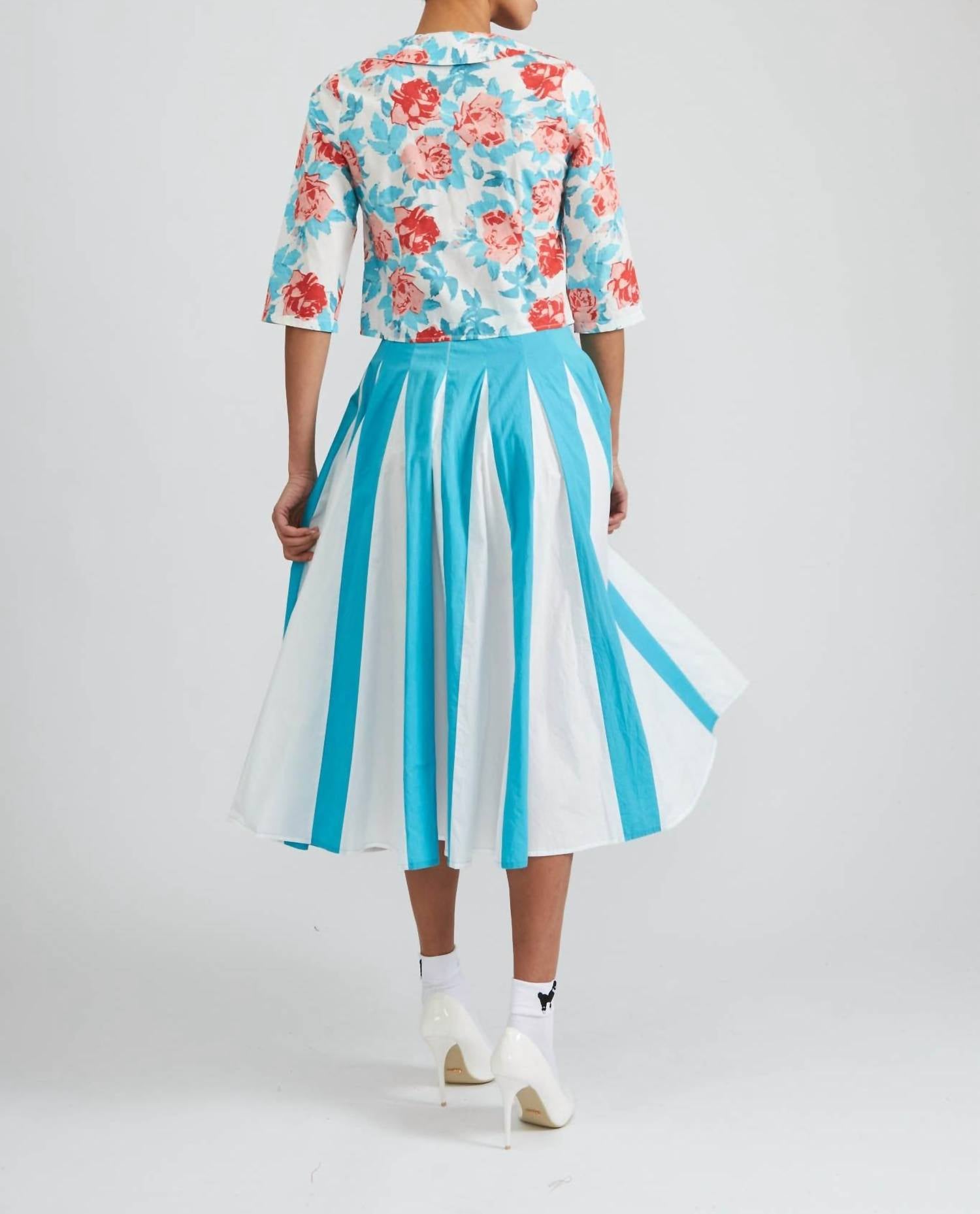 Introducing the Freya Skirt by Batsheva, a chic cheerleader-style piece in vibrant scuba blue. This midi skirt is crafted from 100% cotton poplin and is expertly made in India. It features a convenient zipper closure at the side seam and measures 31.75 inches in length, offering a flattering fit. Easy to care for, simply machine wash cold and line dry. Perfect for seasonal celebrations and preppy spring styles.
