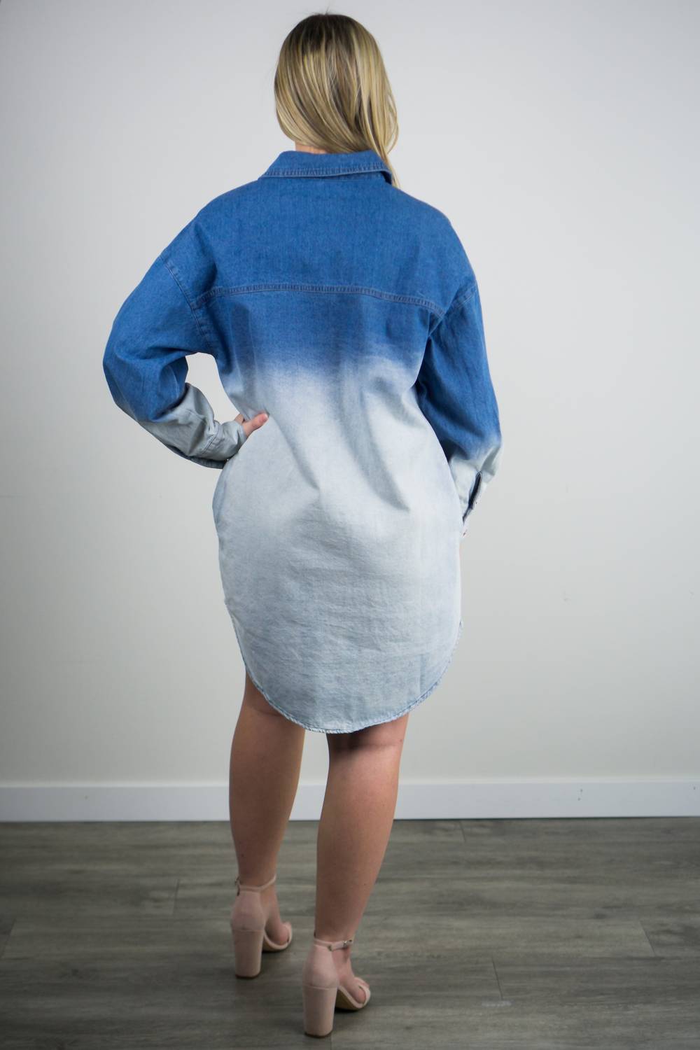 Embrace a day-dreamy vibe with the Faded Away Dress by BB Dakota, a laid-back cotton denim piece that captures the essence of blue skies and cumulus clouds through its dip dye design. This women's mini shirtdress, perfect for a vacation or streetwear, features a classic collar neckline and a solid pattern, enhancing its effortless appeal. Composition: 100% Cotton. Closure: Button closure. Care Instructions: Machine wash and lay flat to dry. Pockets: Yes.