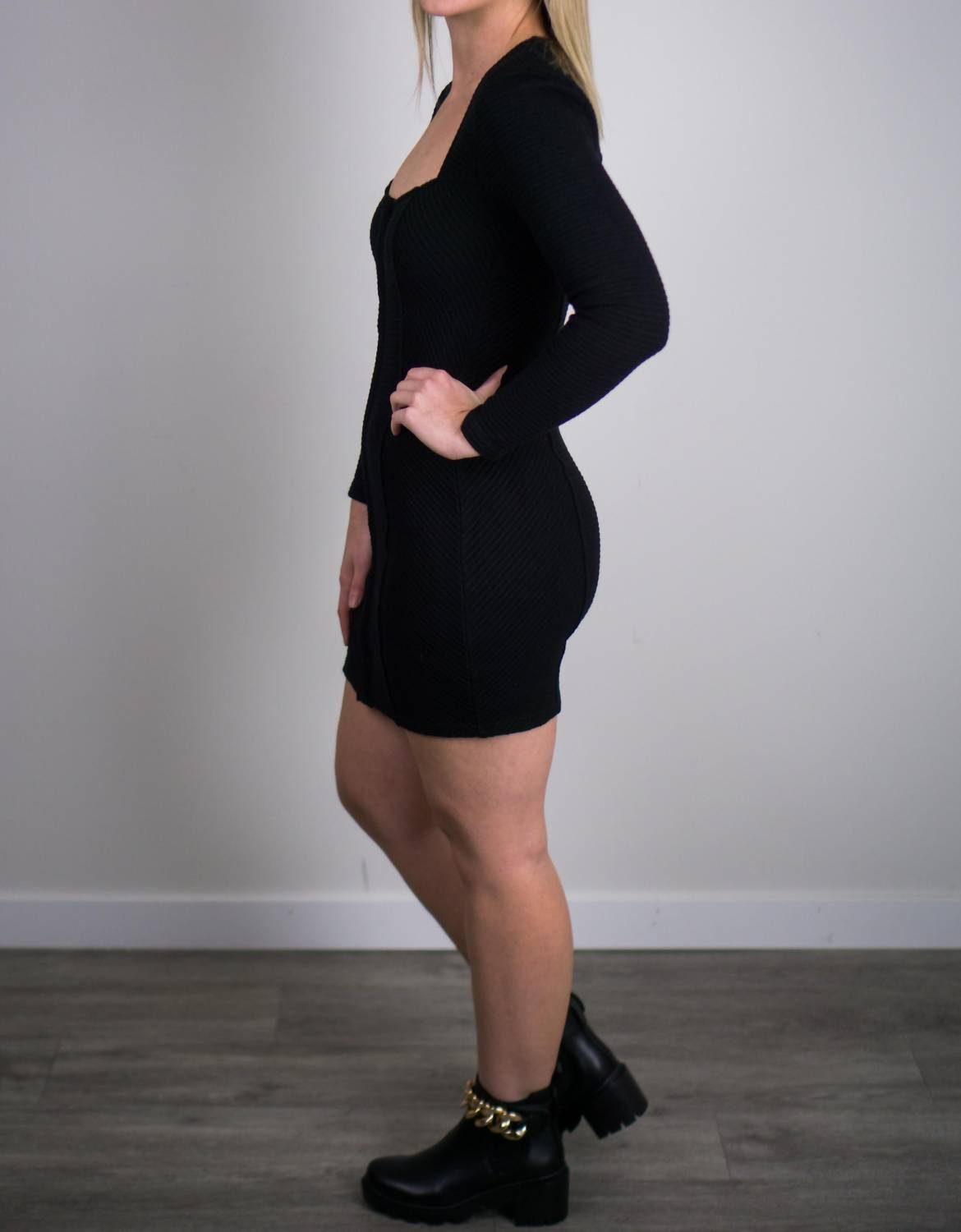 Presenting the Levitating Mini Dress by BB Dakota, an exquisite choice for any evening event. This black, bodycon silhouette features long sleeves and a chic square neckline, seamlessly closed with a hook and eye fastening. Crafted from a blend of rayon, polyester, nylon, and elastane, it offers a flattering fit in a timeless monochrome style. Care for this solid, patterned dress by hand washing as per instructions.