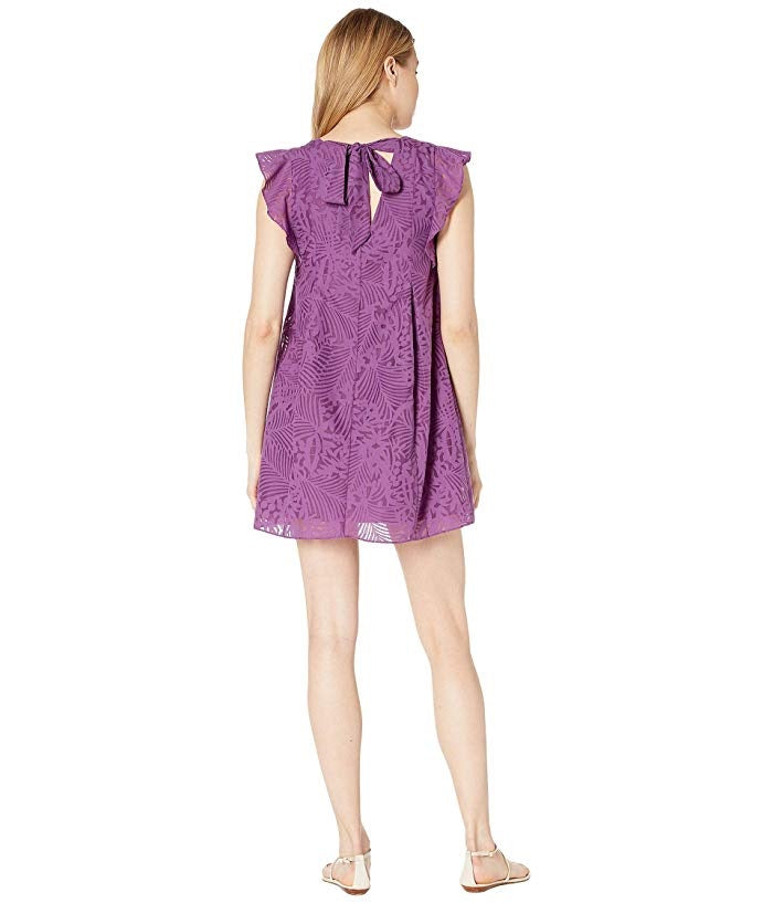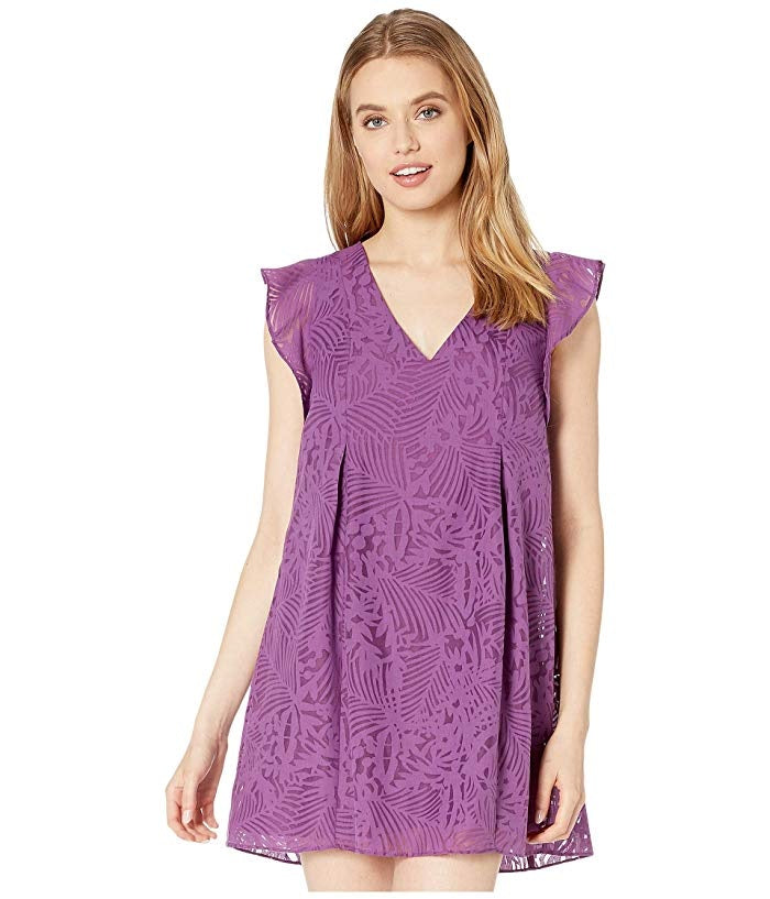 An oversized back bow plays up the evening appeal of this BCBGeneration party dress in a tropical burnout motif accented with bold pleats and short flutter sleeves.| V-neck| Style #ZRE6210330| Short flutter sleeves| Pullover styling| Oversized bow at back neckline; burnout motif throughout| Shift silhouette