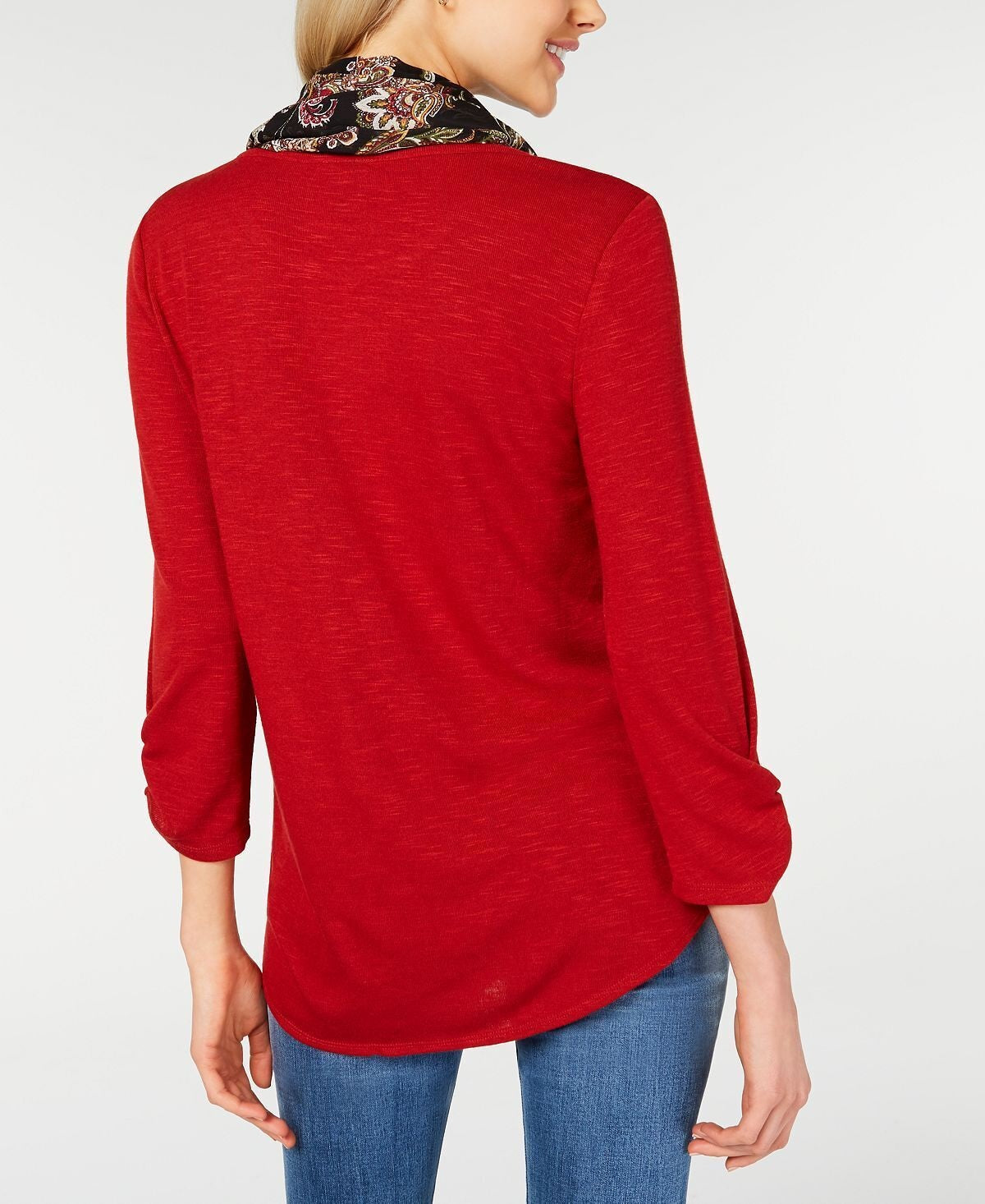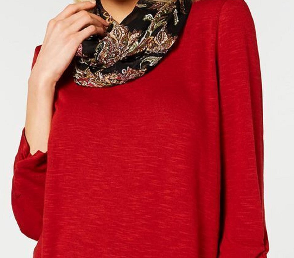 Fashion girls know that scarves add interest| and this ruched-sleeve top from BCX includes a coordinating printed scarf