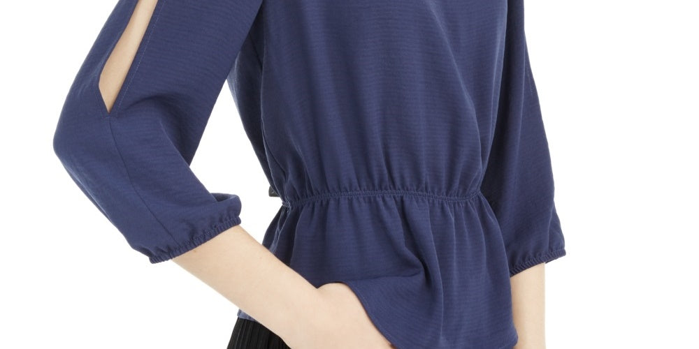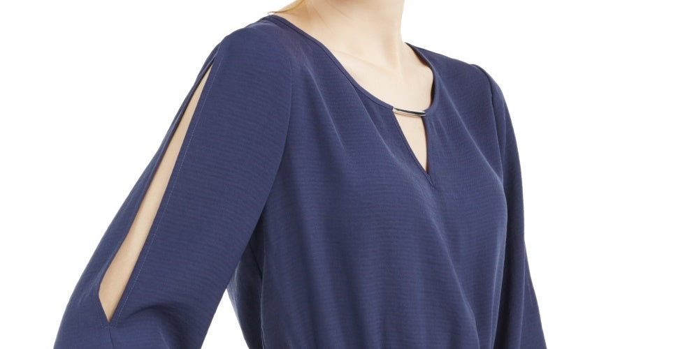 Keyhole scoop neckline with hardware trim|Cinched waistline with peplum detail|Split sleeves with ruched edges|Polyester|Machine washable