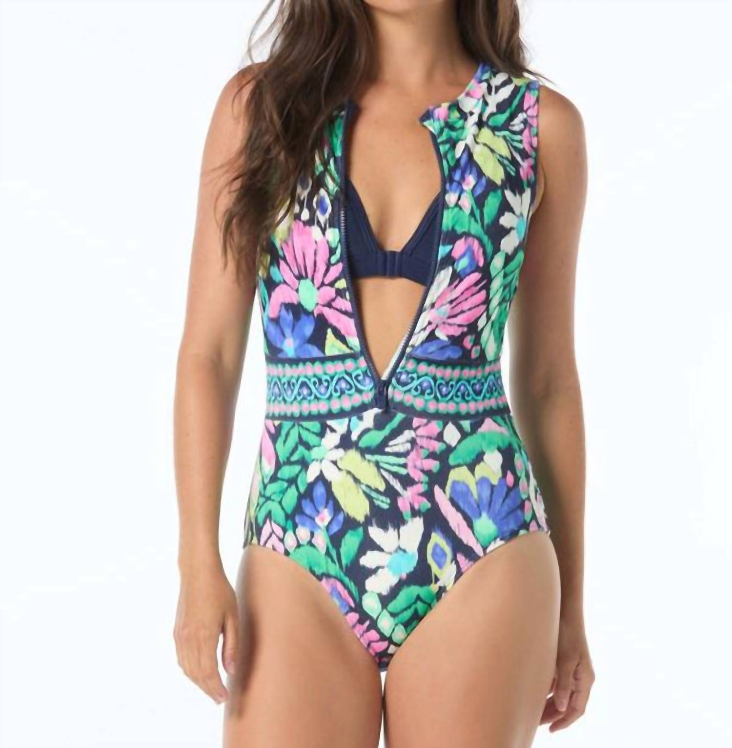 This one piece fits like a glove and covers all the right areas. Introducing the Visualize One Piece Swimsuit by Beach House, a stylish and functional swimwear choice perfect for summer beach days. This sleeveless one-piece features a zip front design, complemented by a separate sport bikini top with stay-put cups and adjustable straps for versatile styling. Crafted from a ribbed nylon blend with ultra-cool mesh lining, it offers 50+ UPF protection and is soft to touch. Composition: 82% Nylon, 18% Spandex with a lining of 83% Polyester, 17% Spandex. Care: Hand wash cold, line dry. Model MK is wearing size 8 (5'9" height, 26" waist, 36" hips, 34C bust).