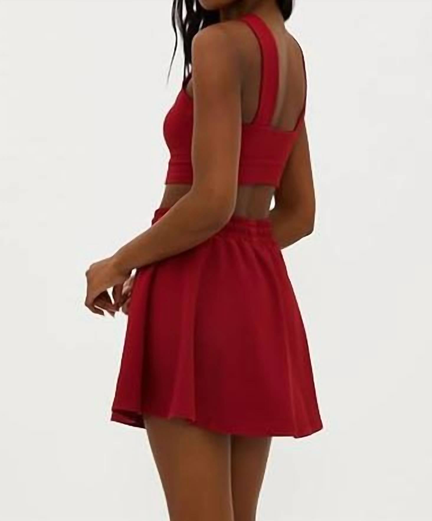 So comfortable you can sleep in it, lounge in it, or work out in it. Introducing the Adia Top by Beach Riot, a stylish high-neck sports bra in Rio Red Waffle, perfect for active women. Crafted with textured waffle fabric, it features a high halter neckline, thick fixed straps, and a supportive wide band under the bust. Composition: 79% Polyester, 21% Spandex. Care: Hand wash. Model is wearing size small.