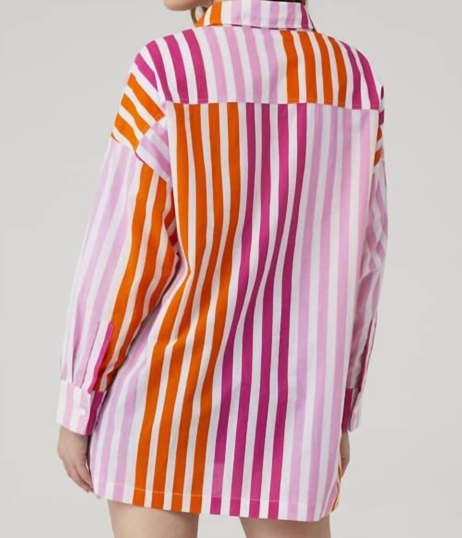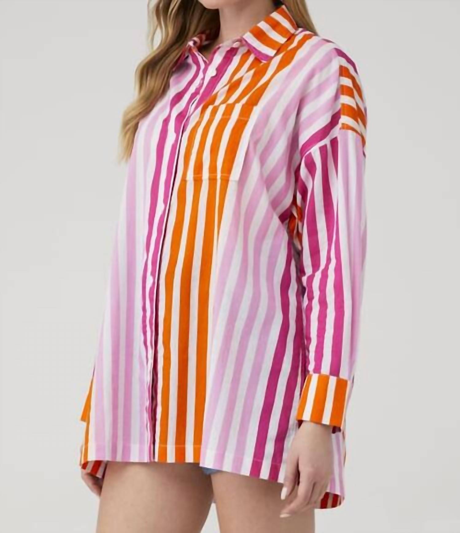 This button down shirt is comfortable yet polished. Introducing the Alexa Top by Beach Riot, a vibrant addition in sunset stripes perfect for your spring travels. This lightweight button-down shirt features long sleeves and a classic collared neckline. Crafted from 100% cotton, it offers breathable comfort with a button closure for easy wear. Care instructions include machine washing and laying flat to dry.