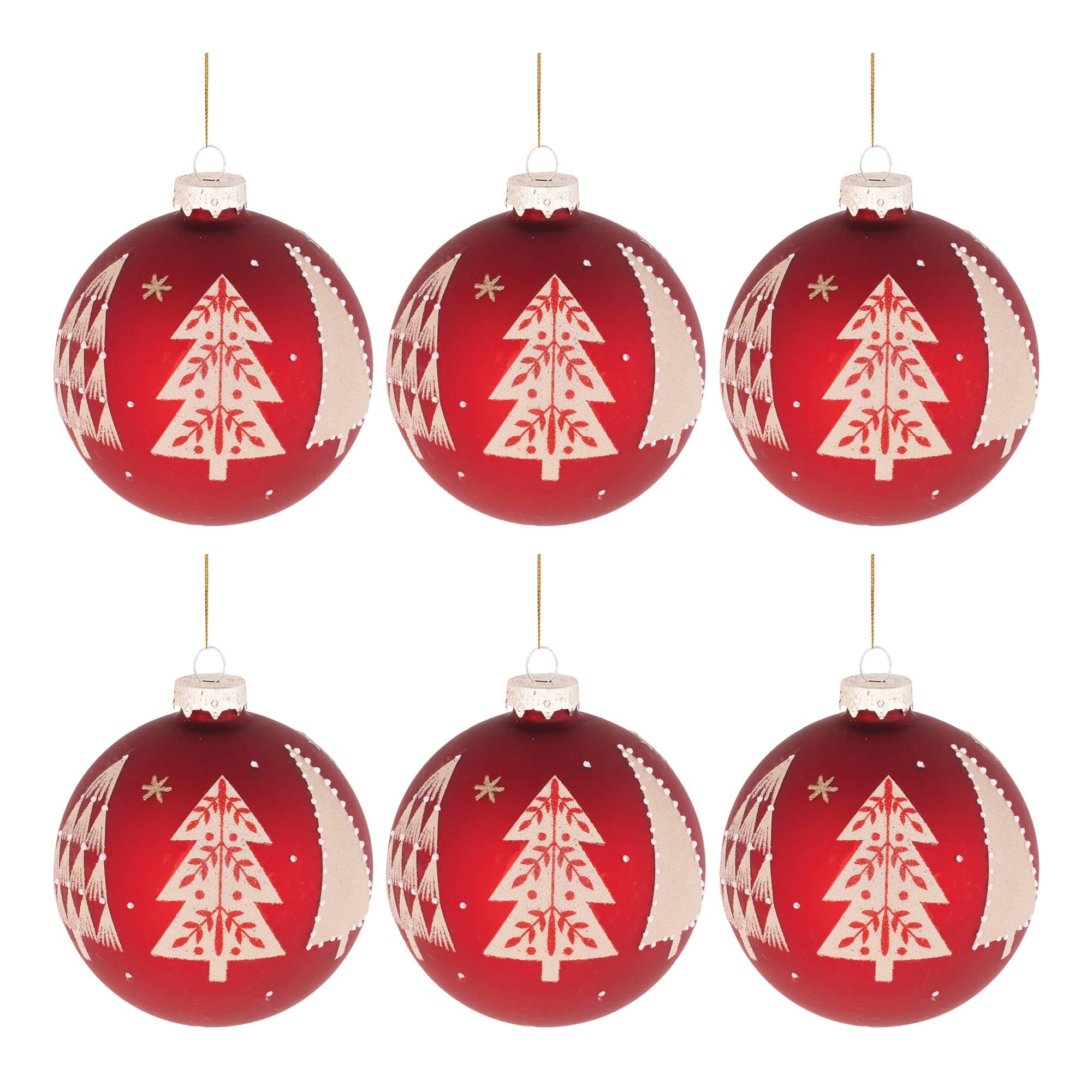 Add a touch of modern elegance to your holiday decor with this set of beaded pine tree ball ornaments. Featuring wintry red and beige tones with a frosted finish, these traditional ball-shaped ornaments are adorned with intricate pine tree artwork and beaded accents. Each ornament is capped with a delicate champagne finish and includes a string hanger for easy hanging. Perfect for your Christmas tree, wreaths, or mantle garland, this set of 6 ornaments bring festive charm to any seasonal display.