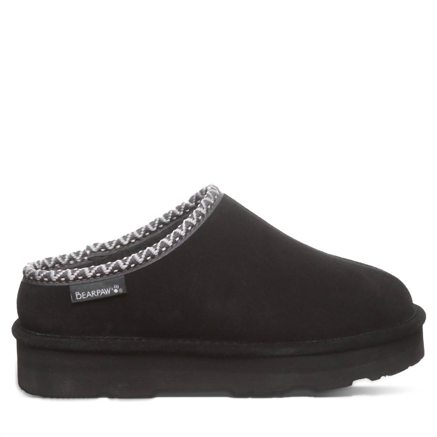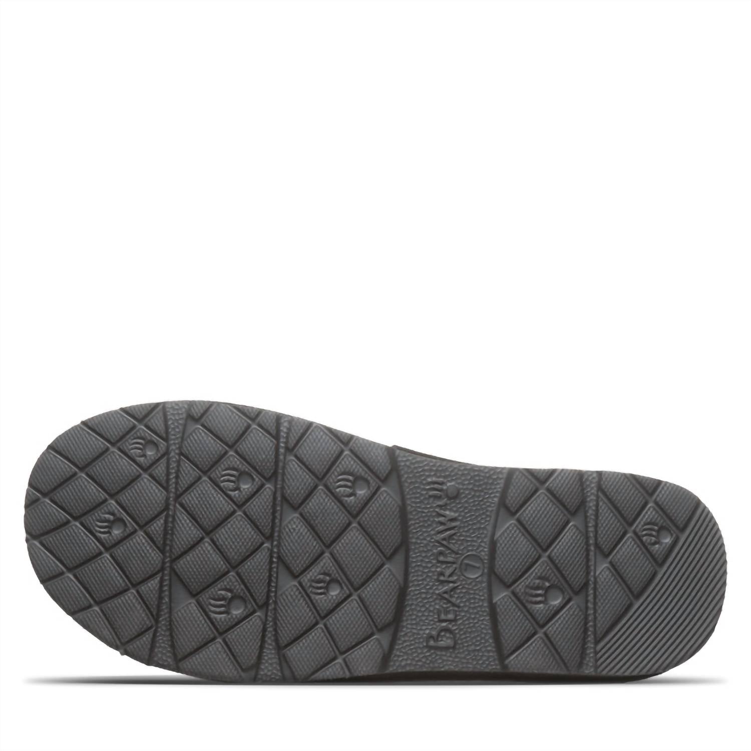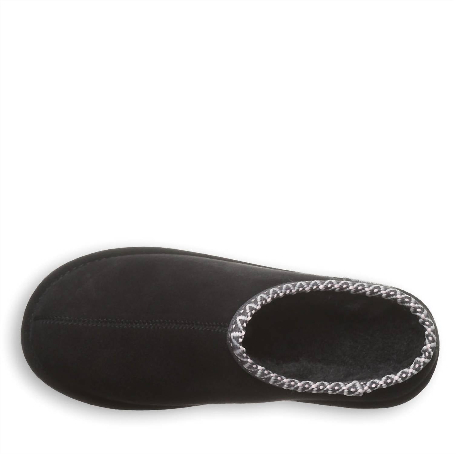 Experience the perfect balance of comfort and style with the Women's Martis Slippers by BEARPAW in a classic black/black palette. Crafted from durable suede, these slippers feature a cozy wool blend lining and a removable comfort footbed, providing support all year round. The lightweight blown rubber outsole and a low platform heel of 1.2 inches offer excellent grip and cushioning, making them ideal for both indoor lounging and outdoor errands. Treated with BearCoat™ Rain & Stain Repellent, these slippers are designed to withstand various conditions while keeping your feet warm and snug.