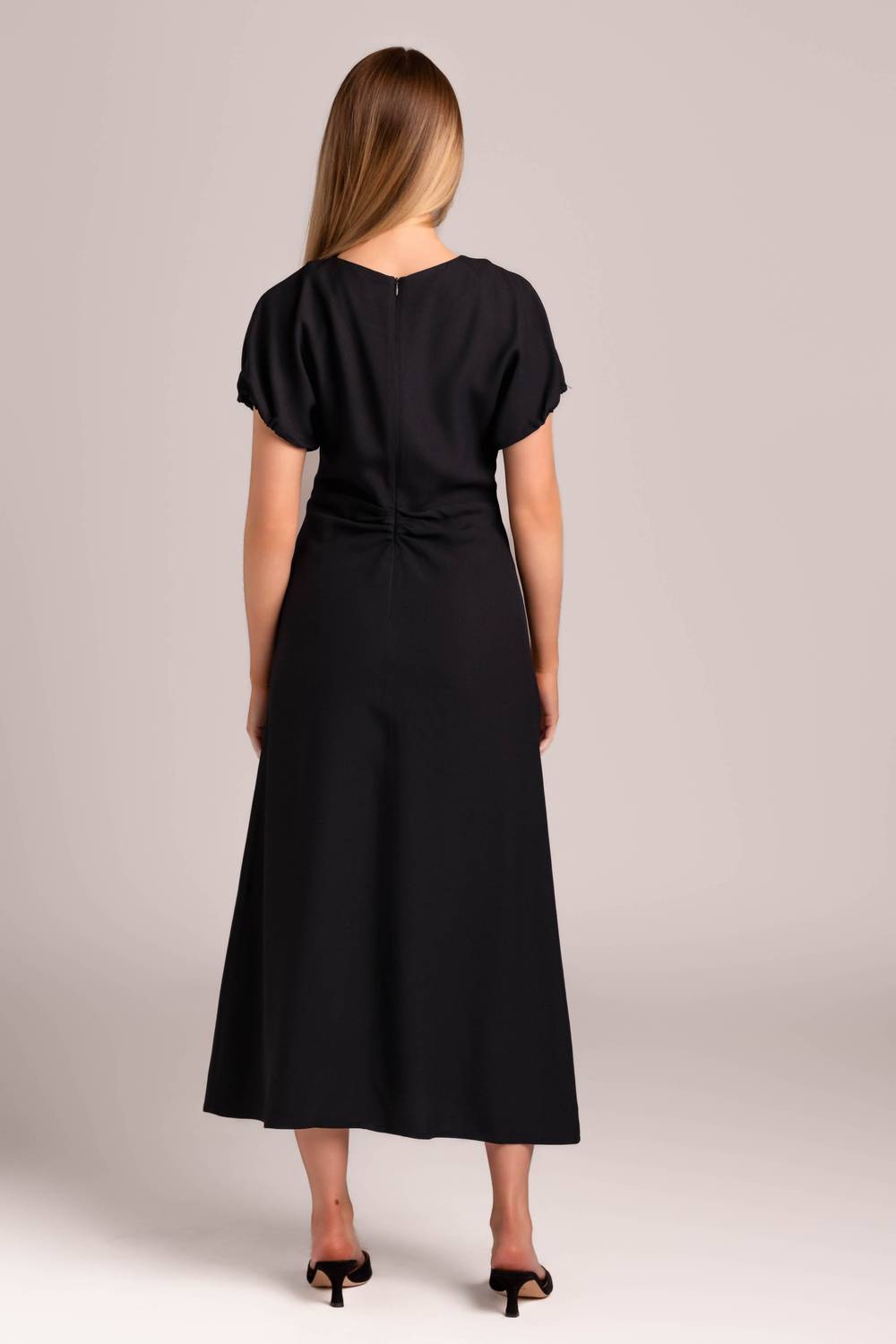 A midi dress so versatile, your options for wearing it are endless. Introducing the beautiful Cinched Midi Dress by Beatrice .b in a striking Eclipse shade. This solid-colored A-line dress features short sleeves and a v-neck, creating an elegant silhouette perfect for a black-tie event. Crafted in a length that gracefully falls to a midi length, it boasts a convenient zip closure and is crafted with minimalist appeal. Care for this exquisite piece by hand washing and laying it flat to dry.