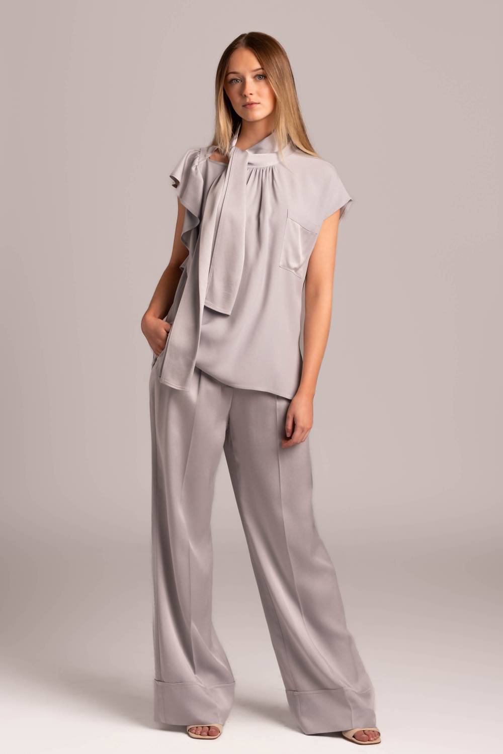 Elevate your vacation wardrobe with the Flowy Trouser Pant With Seam by Beatrice .b, presented in a serene Moonstruck hue. These high-rise, wide-leg trousers offer a relaxed fit and a solid pattern, ideal for pairing with the matching Tie Blouse. Designed with practical features such as an elastic waistband and pockets, they encapsulate the "Quiet Luxury" trend perfectly suited for Spring. Care for these elegant trousers by hand washing and laying them flat to dry.