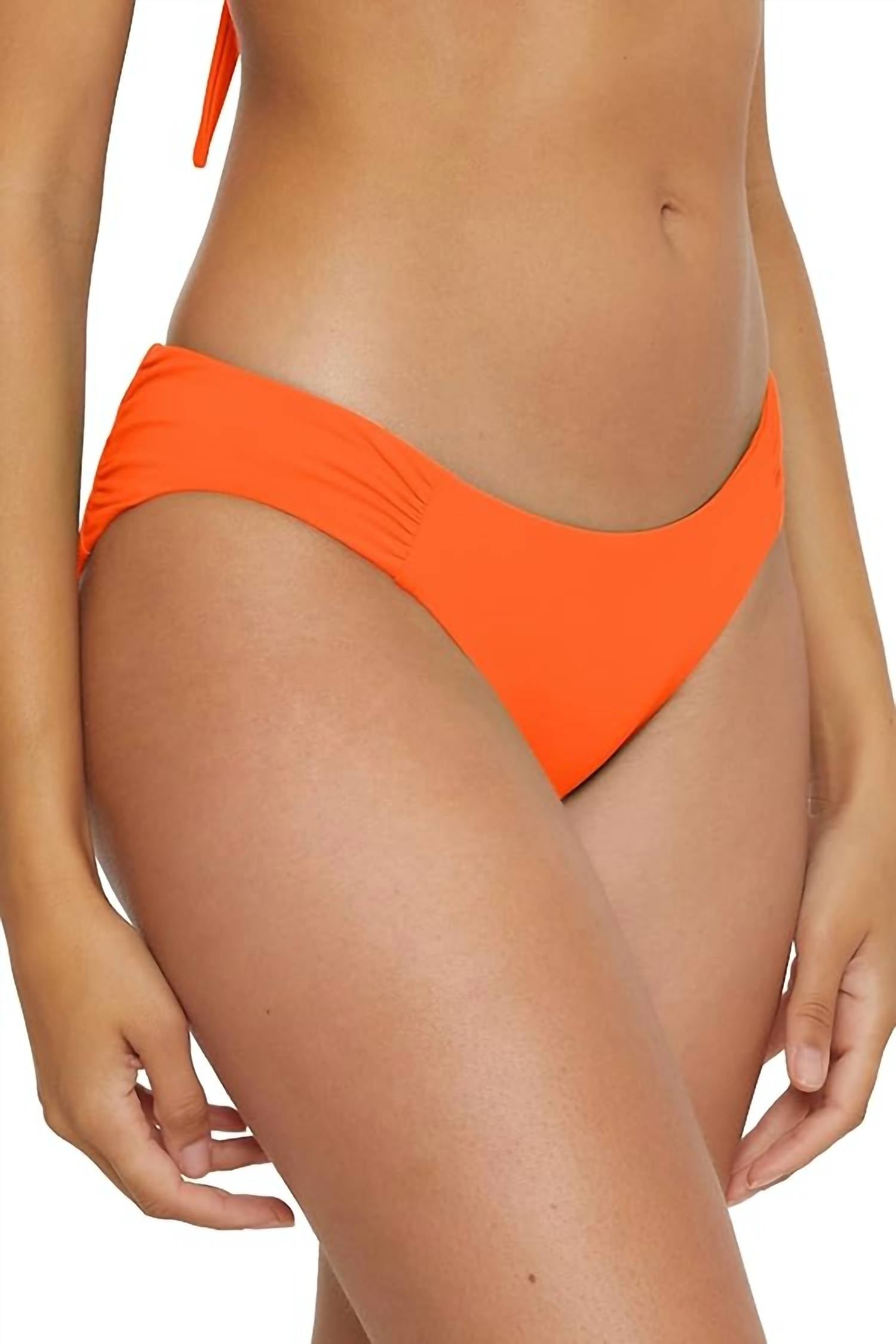 Dream of your next beach getaway in this cute little number. Pair with strappy sandals, a floppy hat, and an oversized tote to complete the perfect vacation look. Embrace style and comfort with the BECCA Standard Baja Mar Hipster Bikini Bottom in a vibrant carrot hue. This swim bottom showcases a flattering cheeky fit with shirred tab sides and a shirred back to enhance your curves. Crafted from 17% Spandex, it ensures durability and a great fit, while being self-lined for added comfort and coverage. Care is simple: Machine wash and lay flat to dry, making it a perfect choice for your summer beach days.