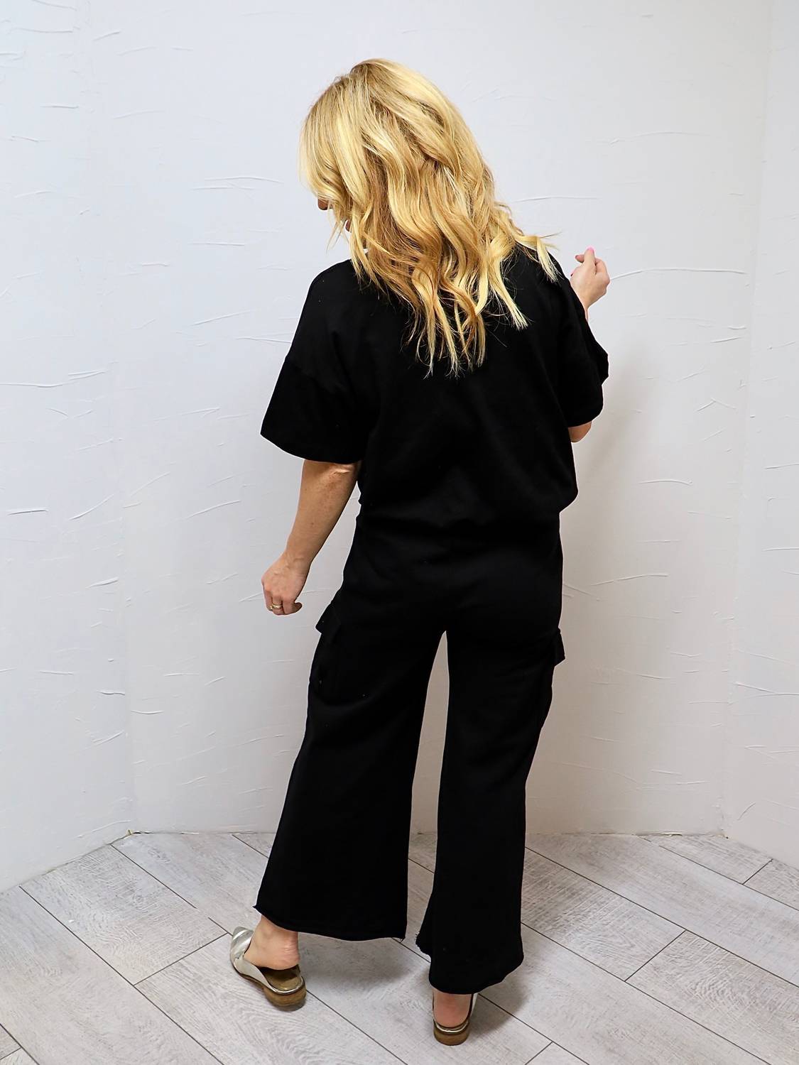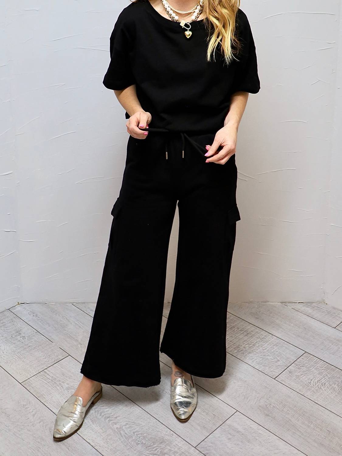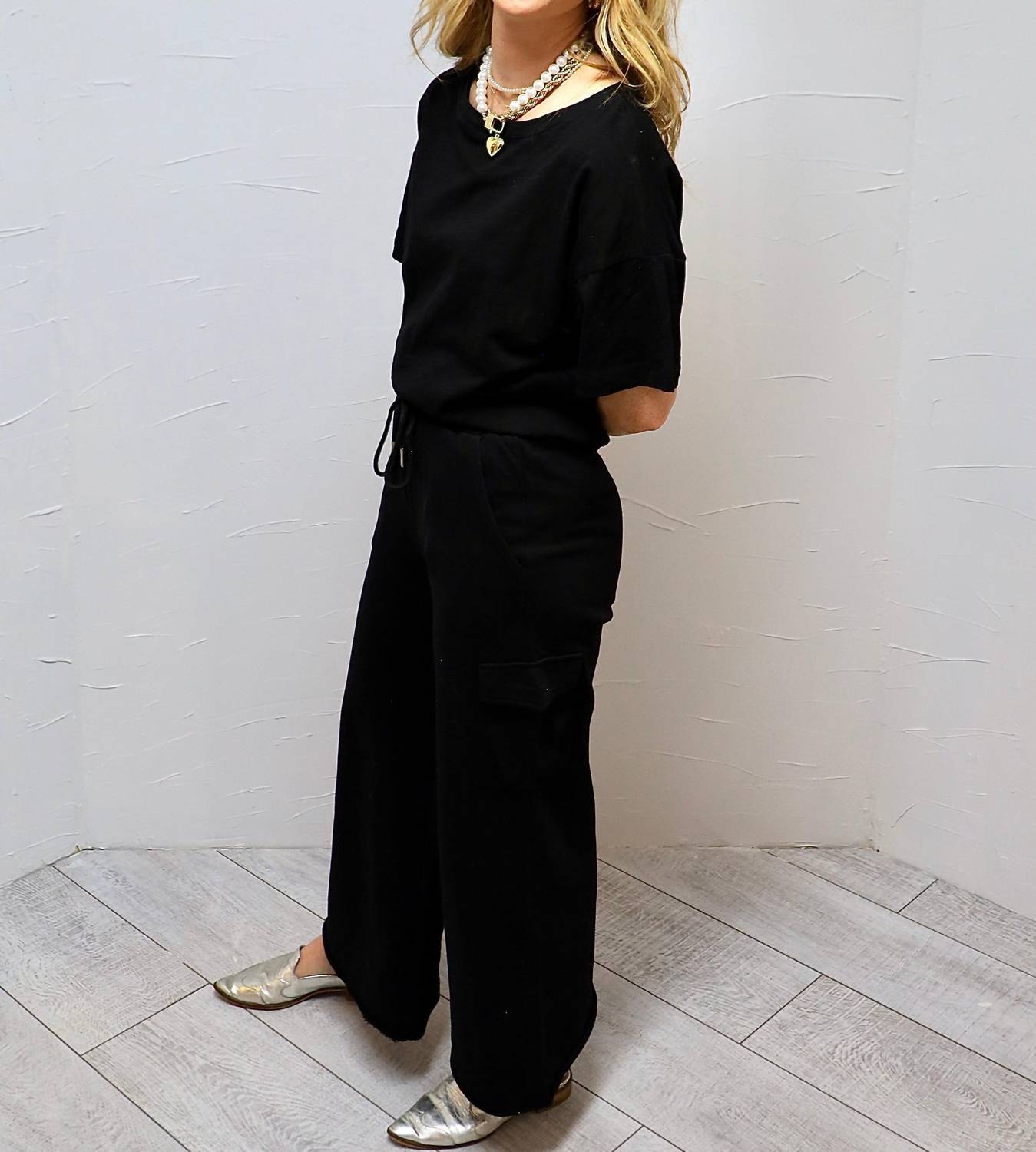 Introducing the Let's Go Somewhere Bottom Pants by Before You, perfect for those who value comfort and style. Featuring a convenient pull-on closure and a wide-leg design, these pants provide an oversized fit that suits any occasion. Crafted from 100% Cotton with a touch of Spandex in the contrast fabric for added flexibility, they come equipped with practical slant forward front pockets and cargo pocket detailing. Elevate your wardrobe with these stylish and versatile pants, available in classic black. Klarisa is wearing a size small.