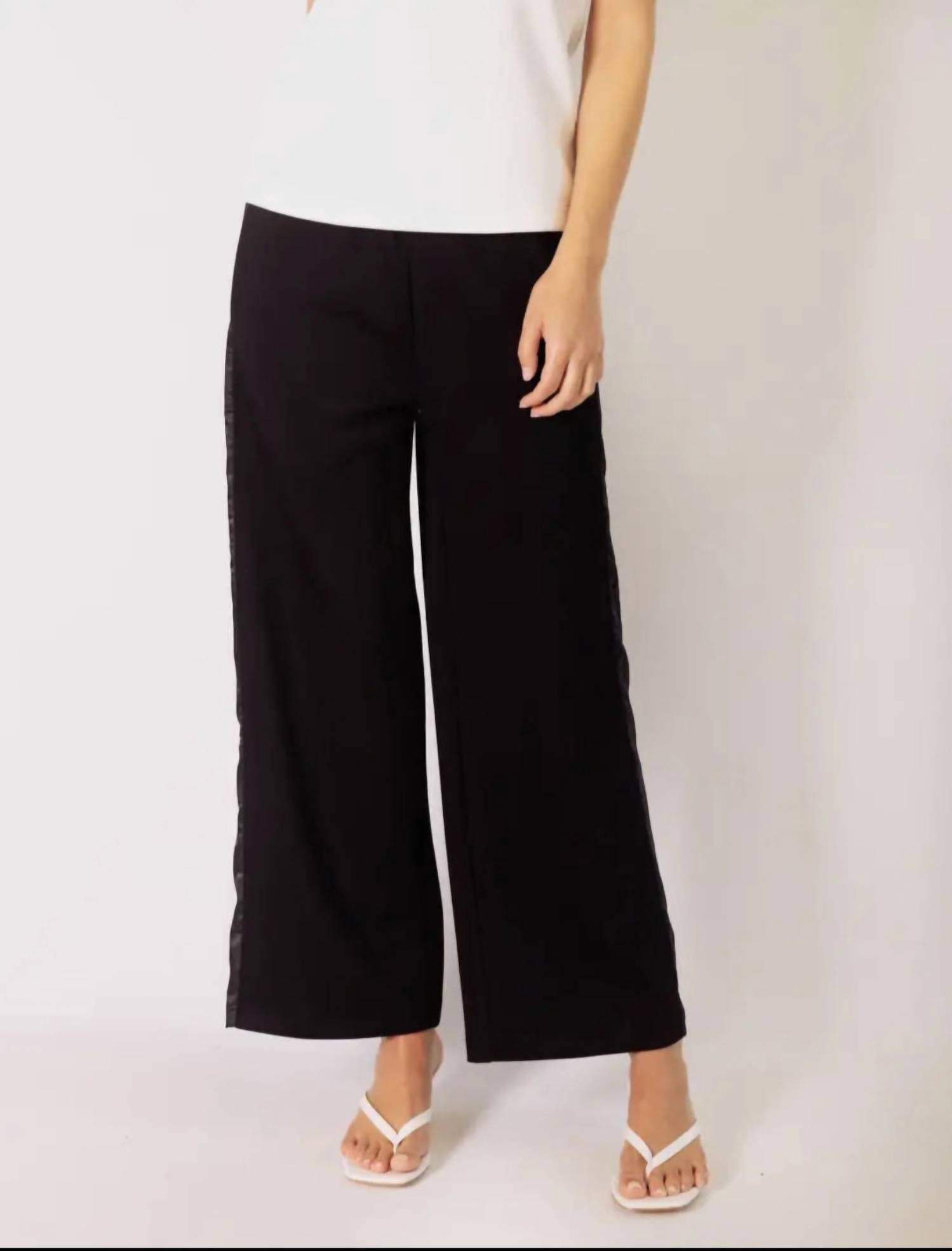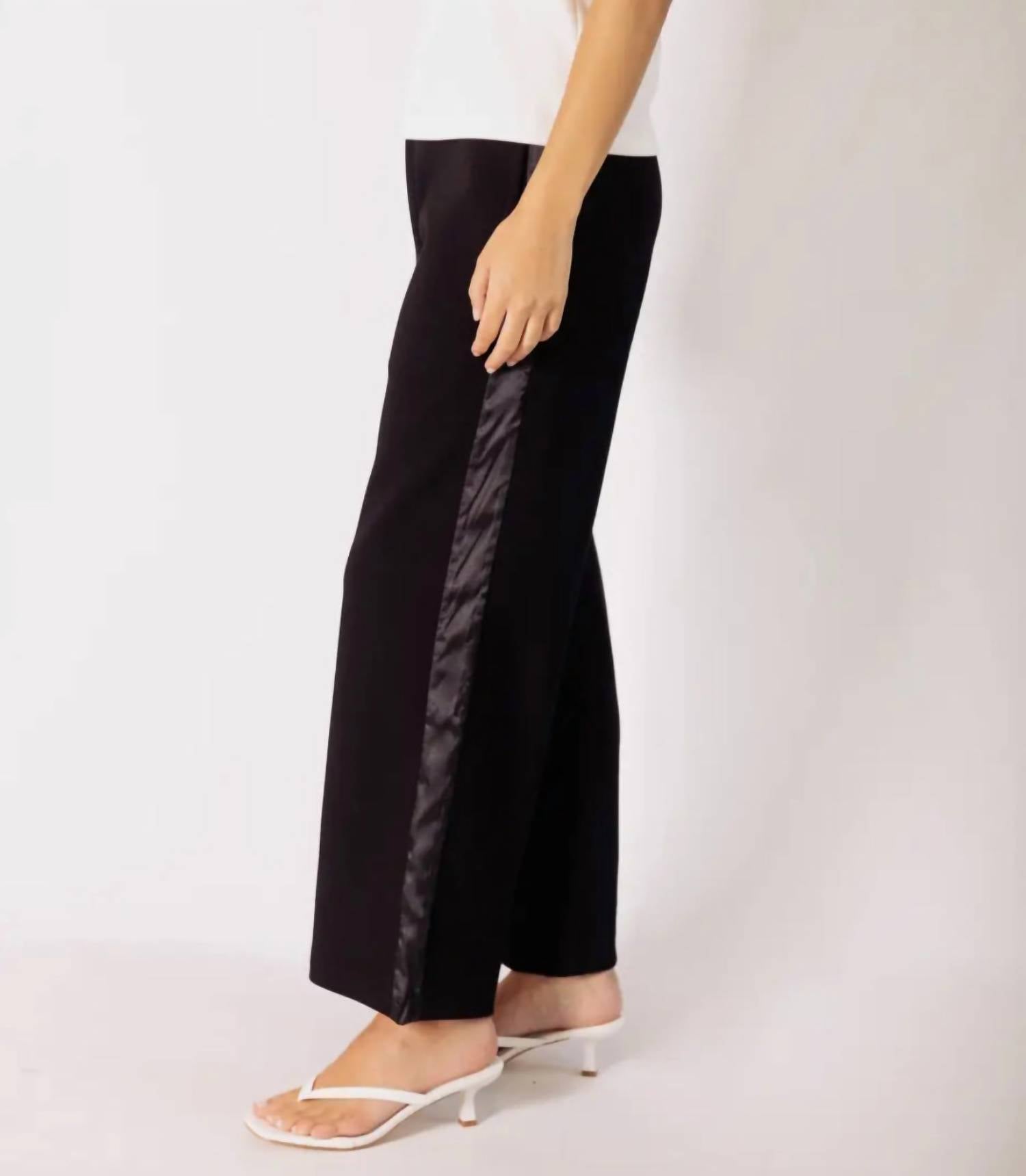 Enhance your wardrobe with the chic Tuxedo Stripe Pant by Before You, expertly tailored for women. These black straight-leg trousers, adorned with a sophisticated satin tuxedo stripe, feature a high-rise waist and a sleek slim fit, secured with a side zipper. With their versatile design, they effortlessly transition from office elegance to evening sophistication. Perfect for fall occasions, pair them with a silk camisole for a refined dinner party look.