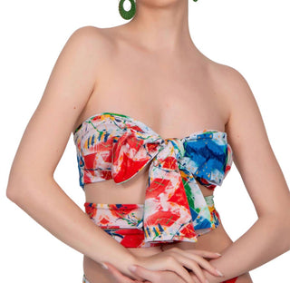 Dream of your next beach getaway in this cute little number. Pair with strappy sandals, a floppy hat, and an oversized tote to complete the perfect vacation look.The two-piece bikini set is a stylish and versatile swimwear option. The highlight of the bikini top is its versatile tying options. Modeled in Size S. Printed pieces made from recycled plastics.