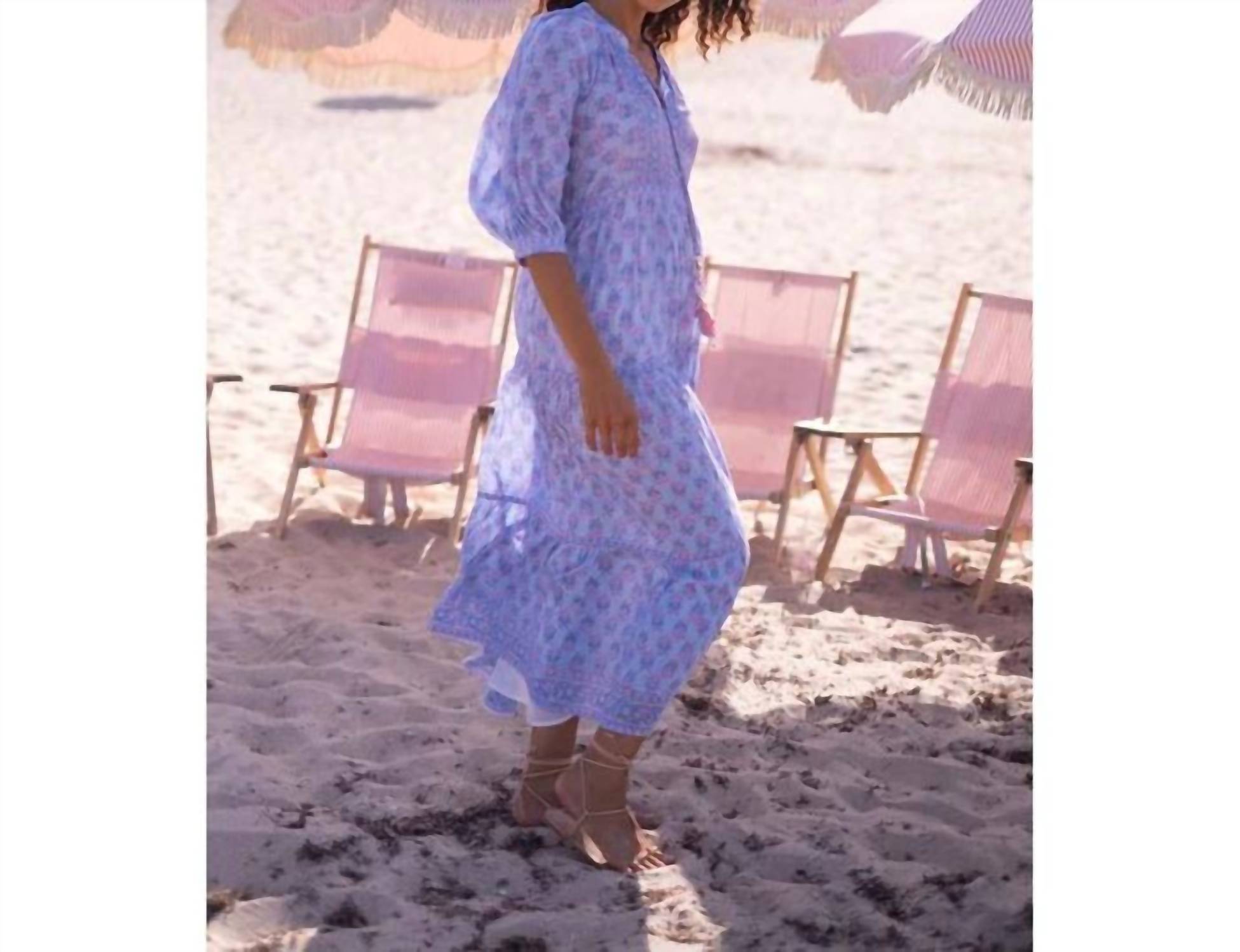 Elevate your wardrobe with the Elizabeth Maxi Dress by Bell by Alicia Bell, a captivating piece crafted for the modern woman. This silk blend dress flaunts elbow sleeves and a kaftan silhouette, adorned with a hand block pattern in a rich blue hue. Closure: Button closure. Care instructions: Hand wash for optimal garment longevity.
