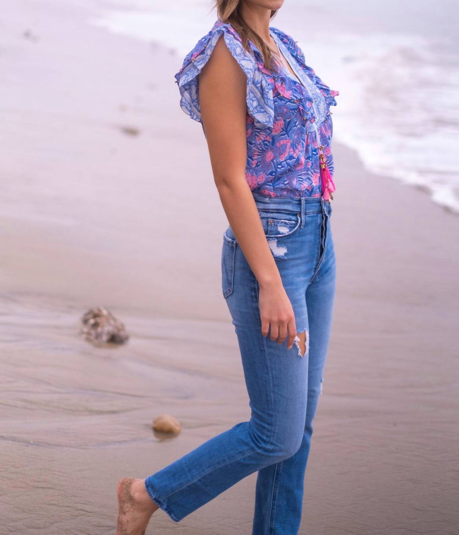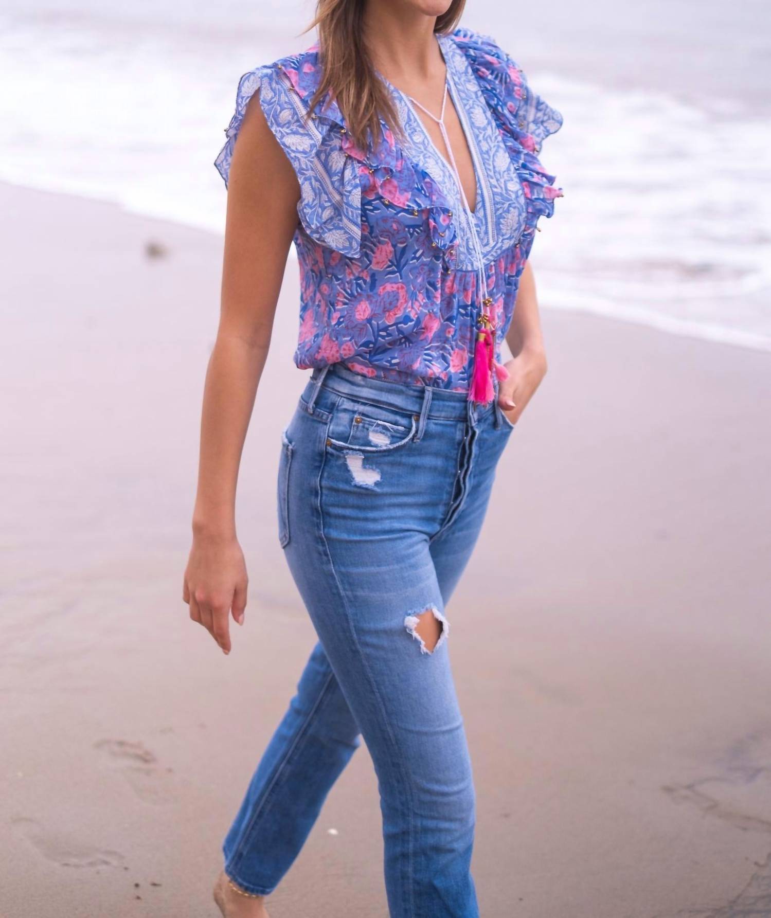 Discover the Kiara Top in Blue Pink Print by Bell by Alicia Bell, an enchanting addition to your wardrobe that embodies boho chic style. This sleeveless blouse is crafted from breathable cotton voile, showcasing a vibrant floral pattern achieved through hand block printing, with charming ruffled details and copper beading for a subtle shimmer. The pull-on closure enhances its effortless wearability, making it a perfect choice for spring vacations. Designed for warm days, this top blends artisanal quality with a romantic silhouette, ideal for both casual and dressy occasions.