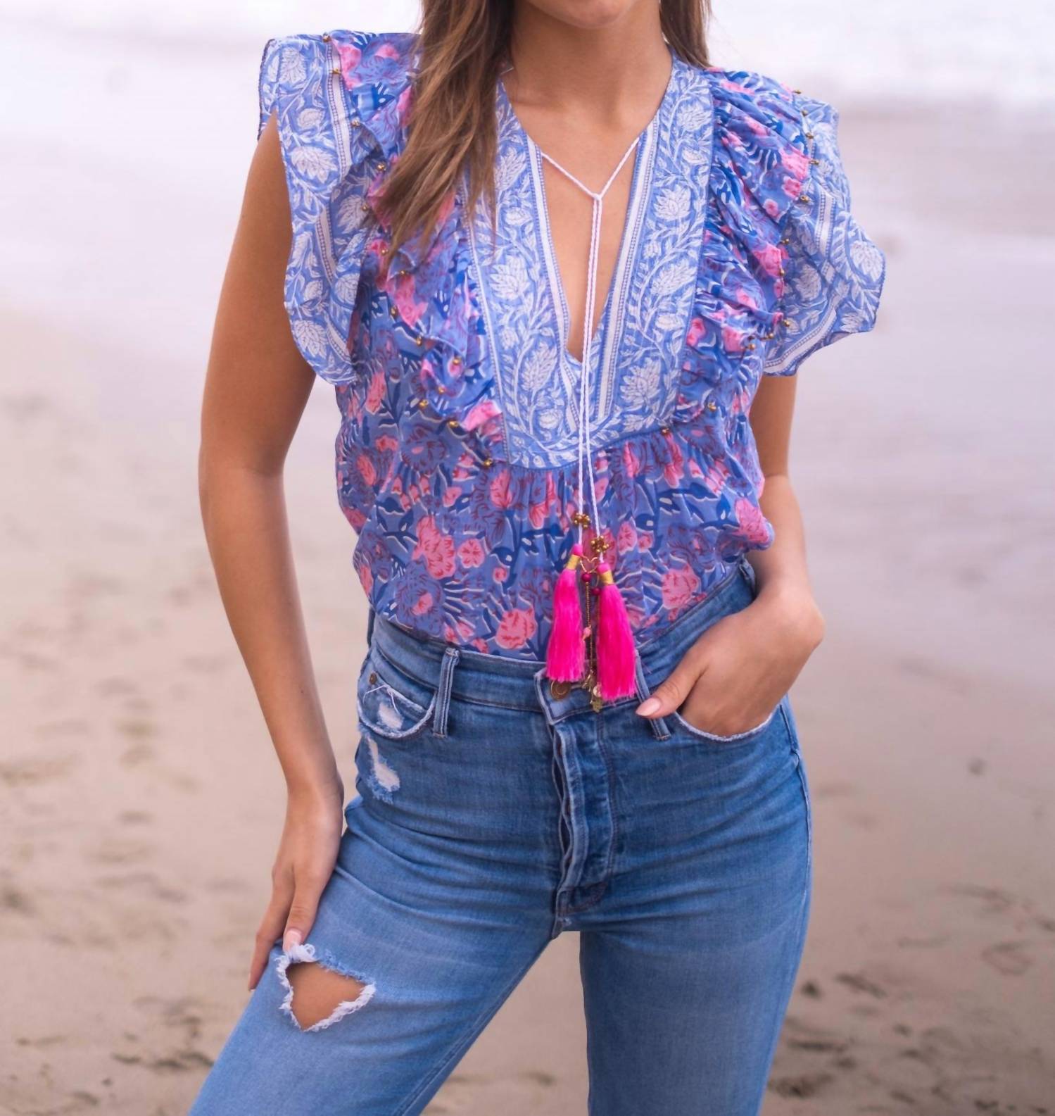 Pair this with your favorite jeans and slides for your next girls night out. Discover the Kiara Top in Blue Pink Print by Bell by Alicia Bell, an enchanting addition to your wardrobe that embodies boho chic style. This sleeveless blouse is crafted from breathable cotton voile, showcasing a vibrant floral pattern achieved through hand block printing, with charming ruffled details and copper beading for a subtle shimmer. The pull-on closure enhances its effortless wearability, making it a perfect choice for spring vacations. Designed for warm days, this top blends artisanal quality with a romantic silhouette, ideal for both casual and dressy occasions.