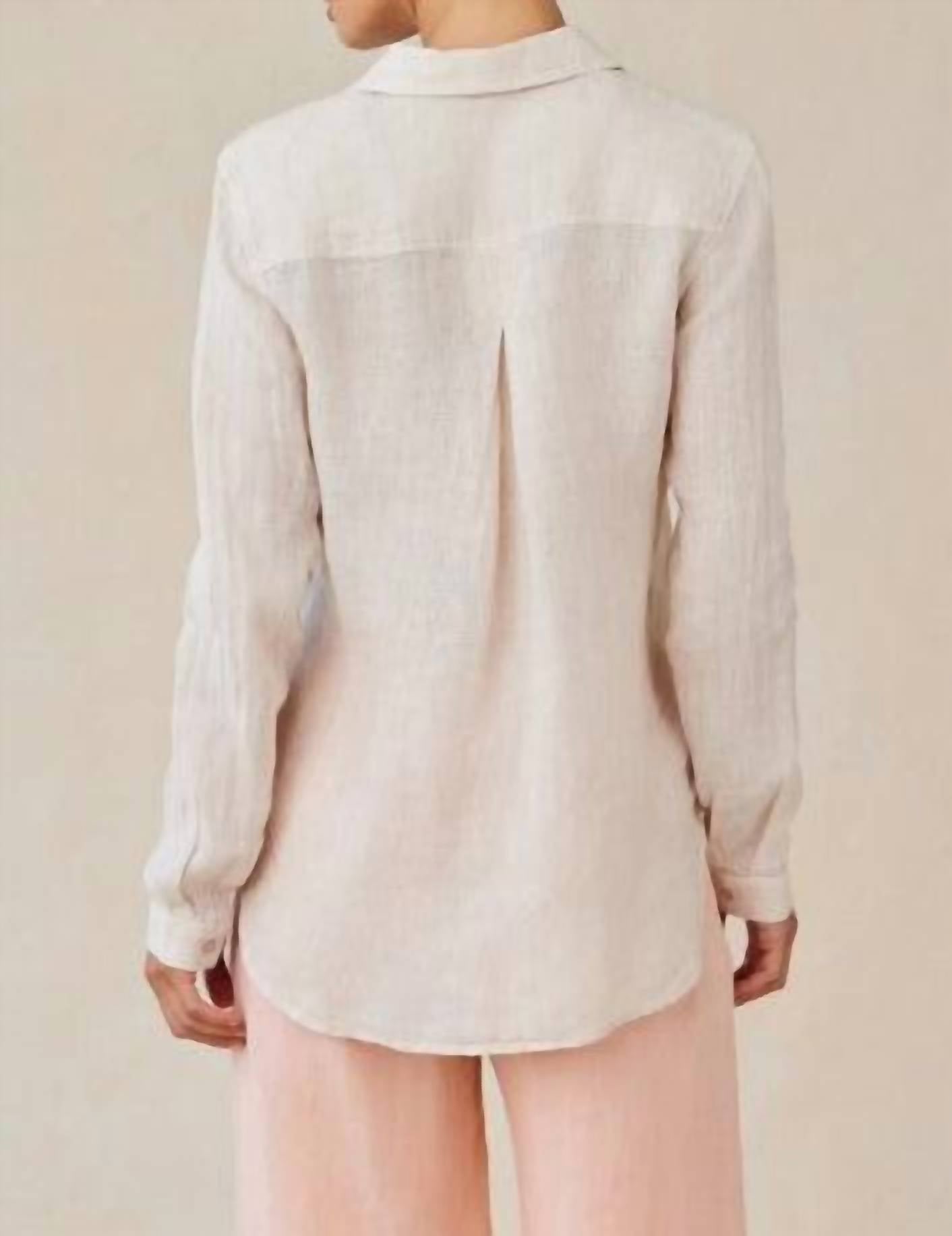 This button down shirt is comfortable yet polished. Discover the Pocket Button Down Shirt by Bella Dahl, a timeless addition to any wardrobe. Crafted from 100% tissue linen, this long-sleeve shirt is perfect for versatile styling. The design includes a classic collar and a convenient chest pocket, with a button closure for a polished finish. Made with slightly sheer fabric, it is suitable for a range of occasions. Care: Machine wash cold and hang dry. Available in white and blue, with sizes ranging from XS to XL. Model is 5'10" and is wearing a size XS.