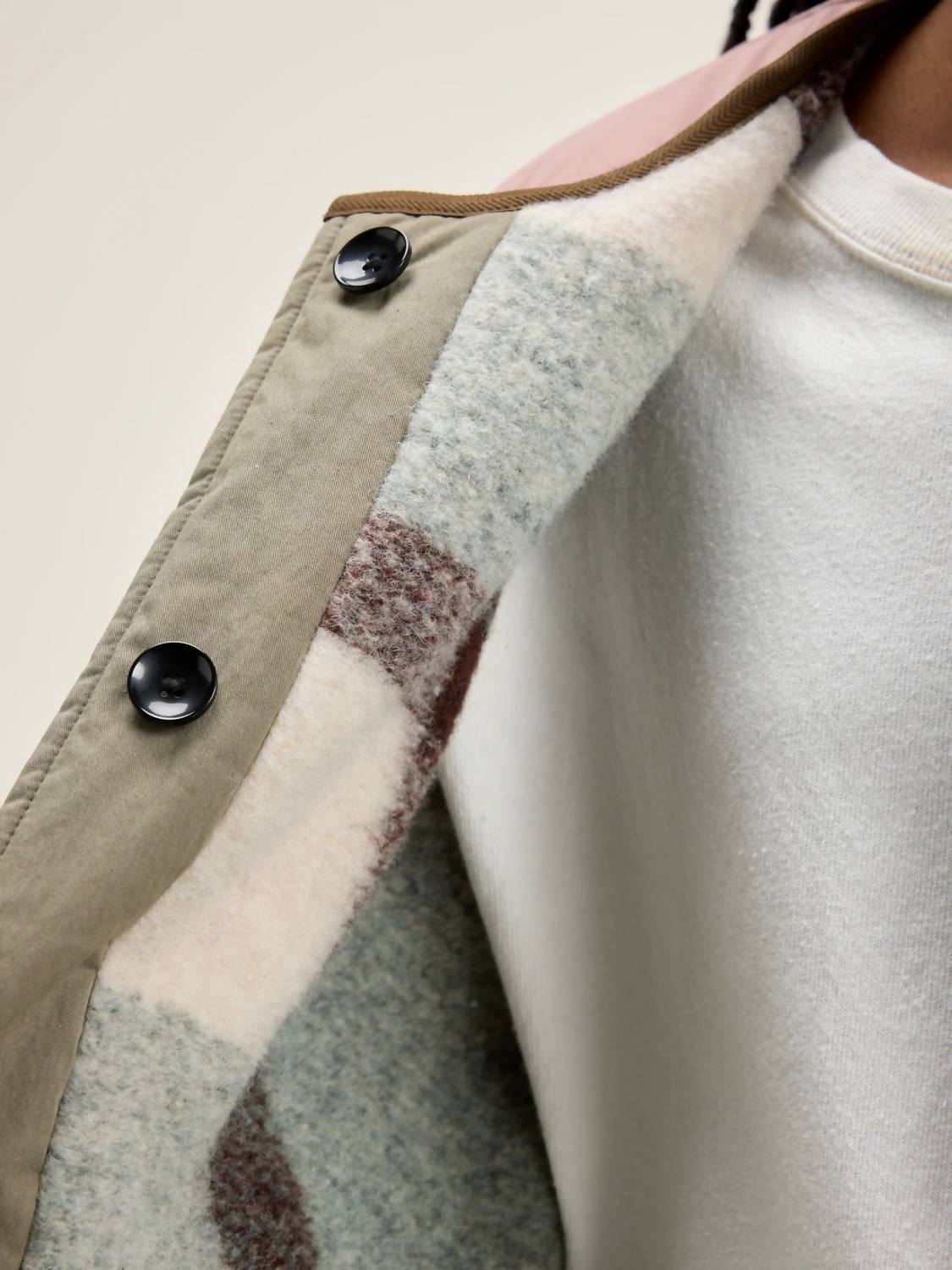 A riff on your favorite classic bomber jacket. Discover the Bellerose Hari Reversible Wool Blend Jacket, a stylishly versatile piece in Blue Plaid and Dusty Rose. This long-sleeve jacket boasts an 80% Wool and 20% Polyester composition, perfect for embracing both warmth and fashion. It features a crew neck with button closure, enhanced by wavy quilting for a unique touch. Care instructions advise against washing, bleaching, drying, or ironing, and recommend dry clean P with care for optimal maintenance.