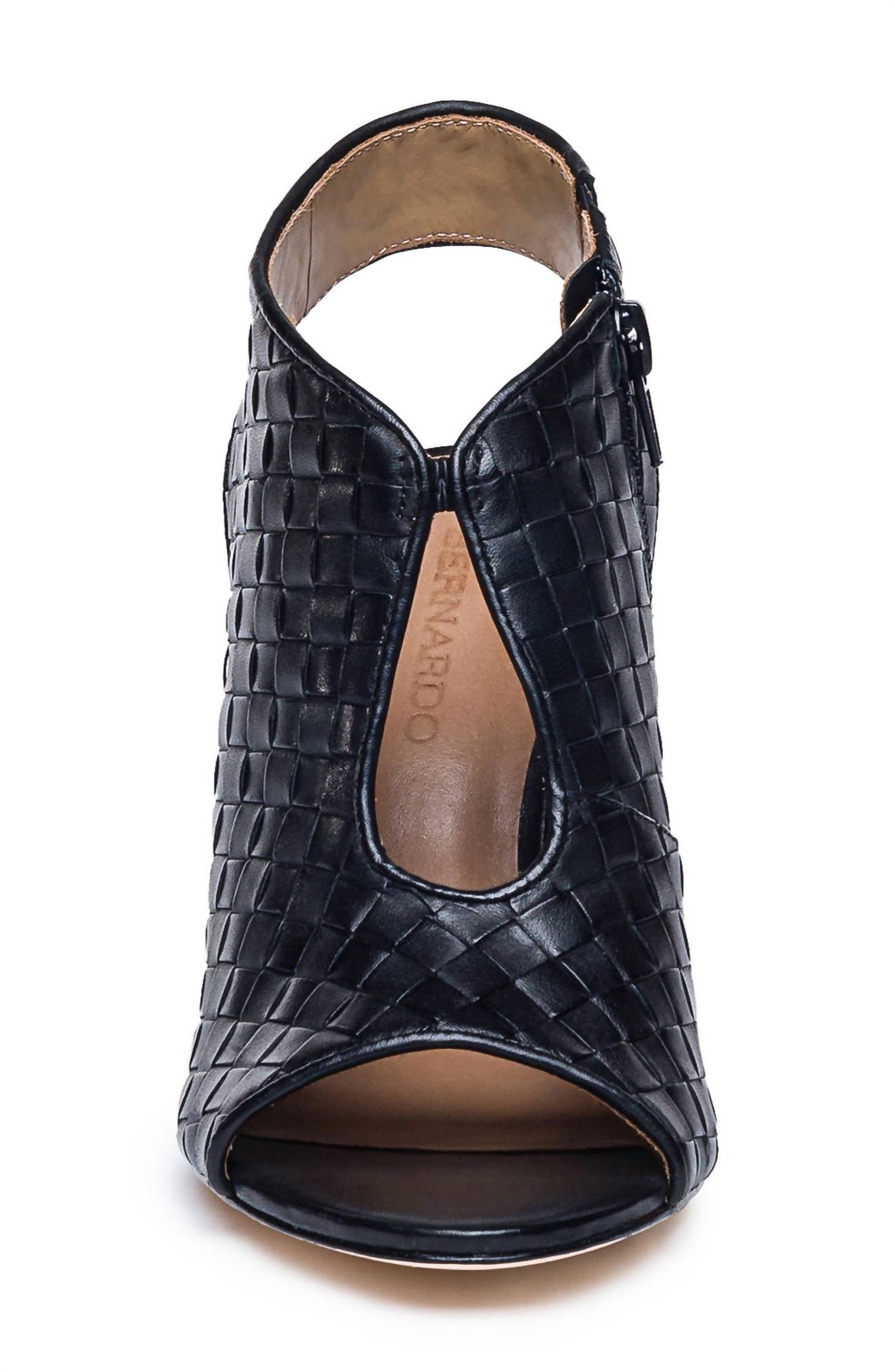 Flowy dresses, cropped pants, and even jumpsuits... this sandal works with them all! Step into elegance with the Women Leonora Sandal from BERNARDO, featuring a chic black open-toed design. The woven leather upper showcases keyhole detailing for a sultry twist, complemented by a stretchy slingback strap and side zipper closure. Crafted in Brazil, this high stiletto heel sandal ensures comfort with a padded, cushioned footbed. Made with a complete leather composition, it's perfect for adding a touch of sophistication to any wardrobe.