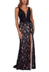 Be totally elegant at your formal event in this sleek lace gown with a daring V-neck from Betsy & Adam. | Approx. 61-1/2 long from center back neck to hem| Floor-length formal dress| Lace; Delicate and light texture| V-neck; Gown silhouette| Back zipper closure| Illusion detail at front neckline; slit at front hem
