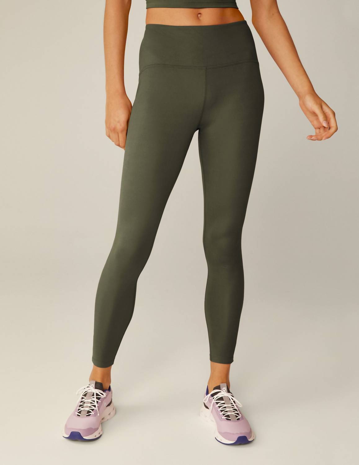 Leggings you can dress up or down for any occasion. Introducing the BEYOND YOGA Powerbeyond Strive Midi Legging in Modern Olive, expertly designed for both style and performance. With an inseam of 24 inches, these leggings feature a pull-on closure and a 4-inch contoured waistband with powermesh for enhanced support, along with a convenient pocket at the back waistband. Made in the US from 95% polyester and 5% elastane, they offer a flattering skinny leg style that fits comfortably between the calf and ankle. Machine wash.