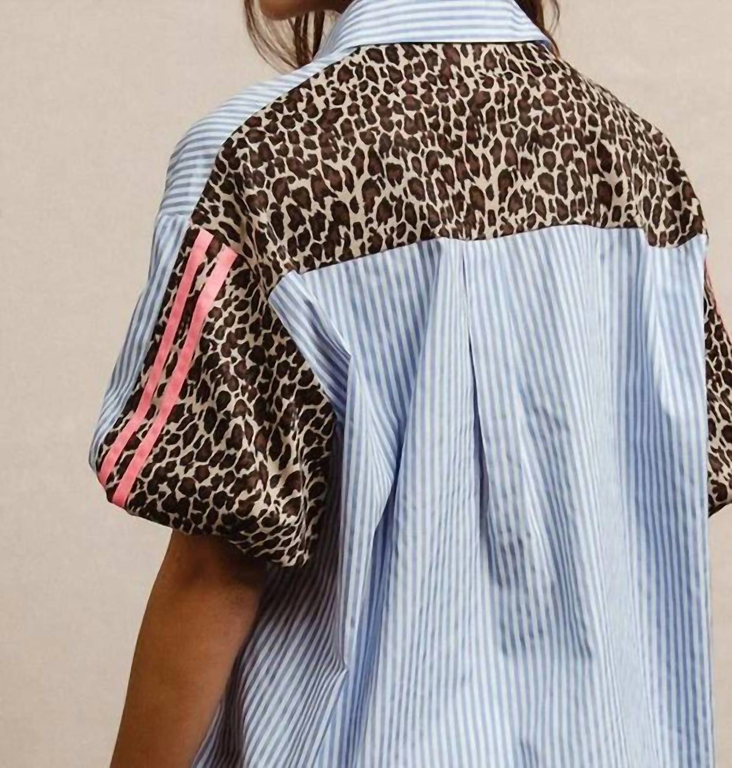 Make a statement with the Stripe Pattern Shirt With Leopard Top by BiBi, perfect for those looking to stand out. This women's shirt features short sleeves with daring leopard print accents and a collar neckline. Crafted from a blend of 65% polyester, 35% cotton, this piece includes a 97% polyester, 3% spandex contrast and a 100% polyester lining offering a hint of stretch and comfort. Care Instructions: Machine wash.