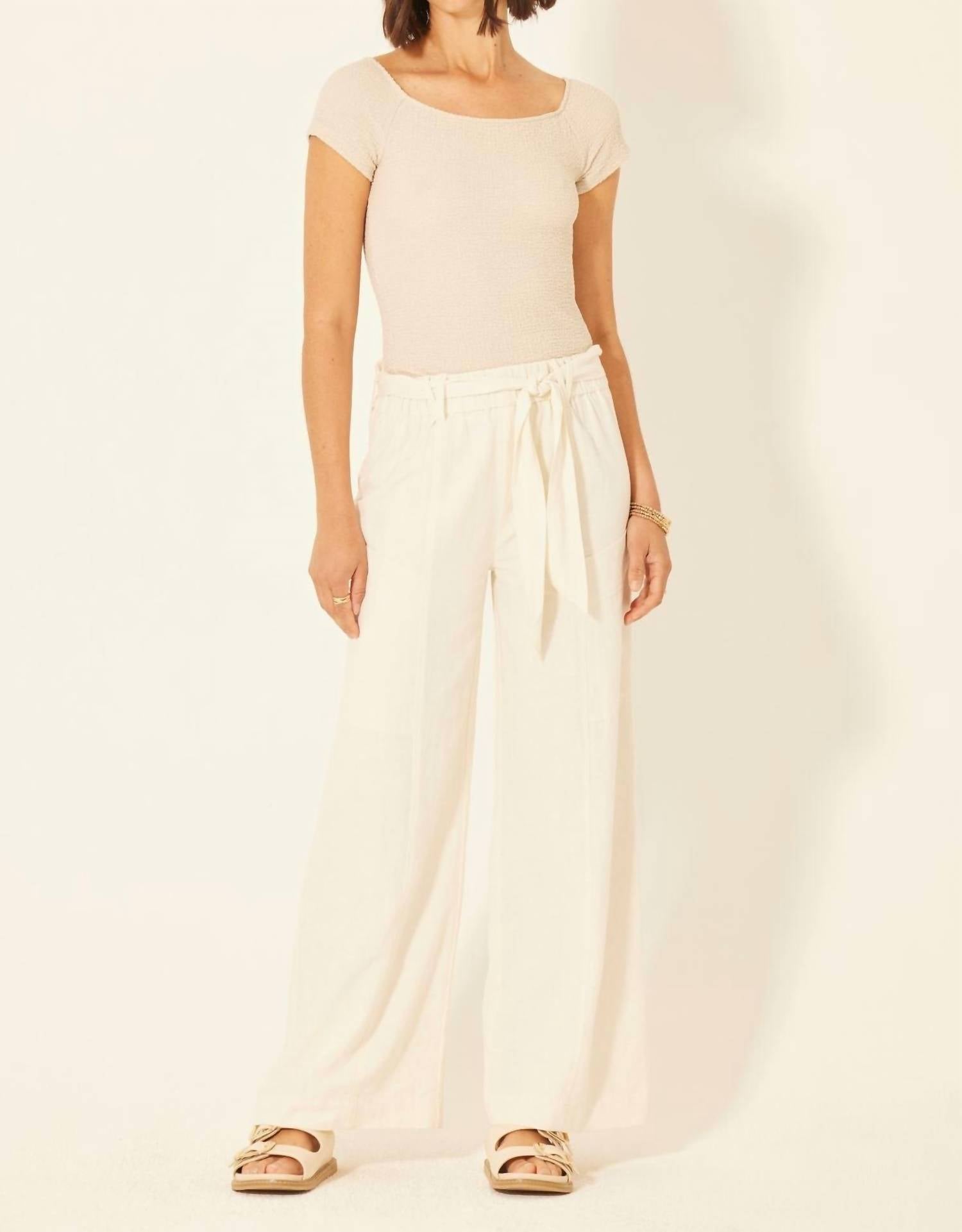 Experience both comfort and style with the BILA77 Garnet Tie Front Pant in Whisper White. These high-rise, straight-leg pants feature a tie front design and a practical elastic waist, complete with cargo side pockets for added functionality. Crafted from 46% Rayon, 40% Cotton, and 14% Linen, these whisper-soft pants are perfect for summer travels and Easter gatherings. Closure: Pull-on style. Care Instructions: Hand wash to maintain their maximalist appeal.