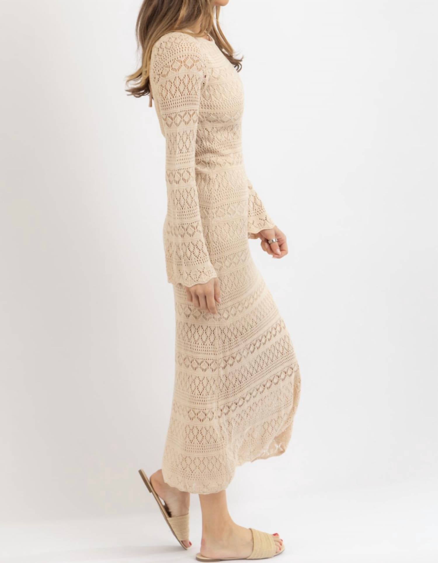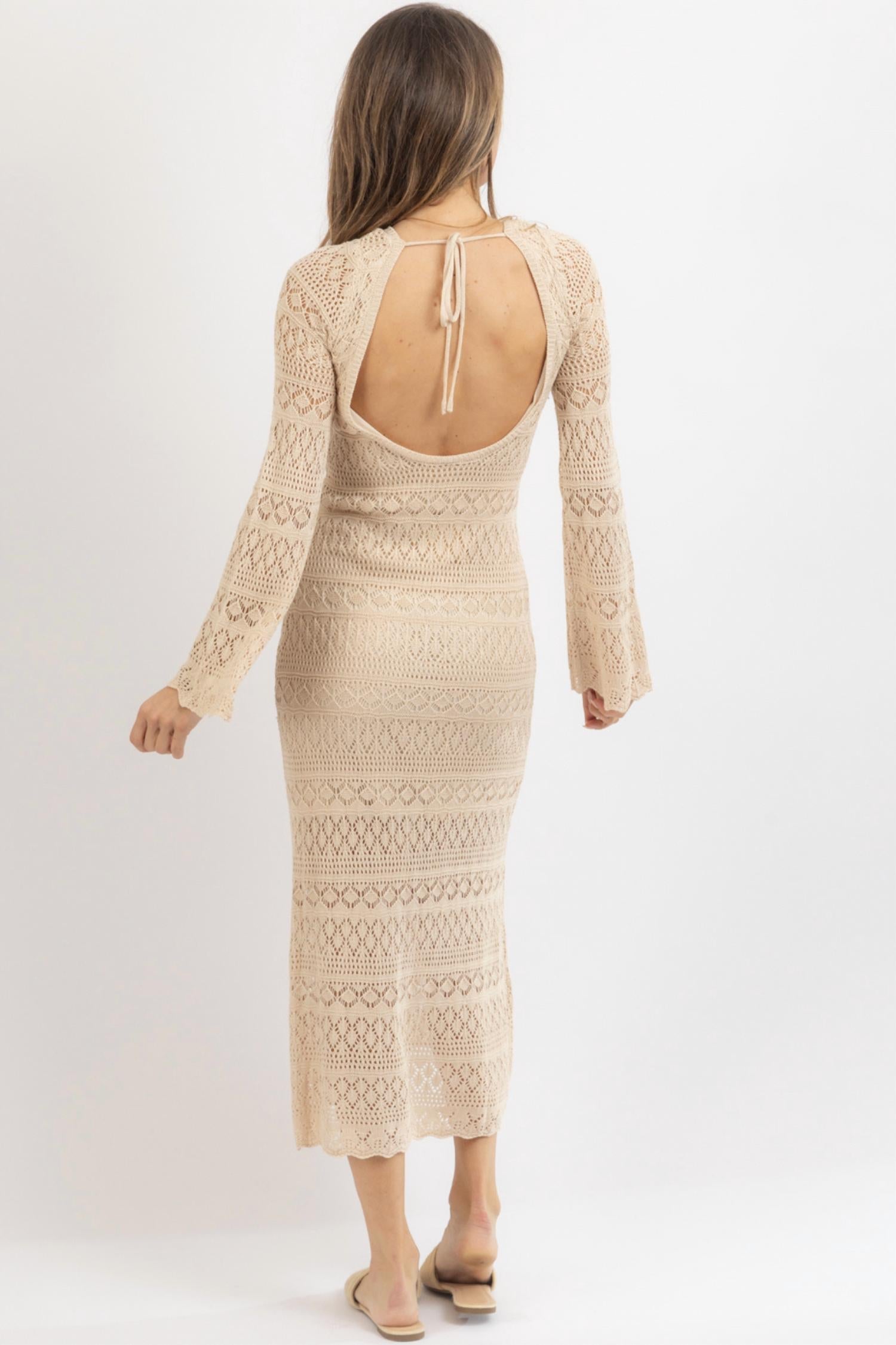 Style this maxi with your favorite statement necklace and sandals for the perfect look. Introducing the Palos Verdes Sandshell Maxidress by BILA77, a boho chic essential in elegant beige. This maxi-length dress features long flare sleeves and a keyhole tie closure at the front, complemented by intricate crochet details throughout. Crafted from 100% polyester with a full lining, it's designed for a textured, bodycon silhouette. Care: Machine wash and tumble dry. Naomie is wearing a size small (5'8" height, Dress size 2).