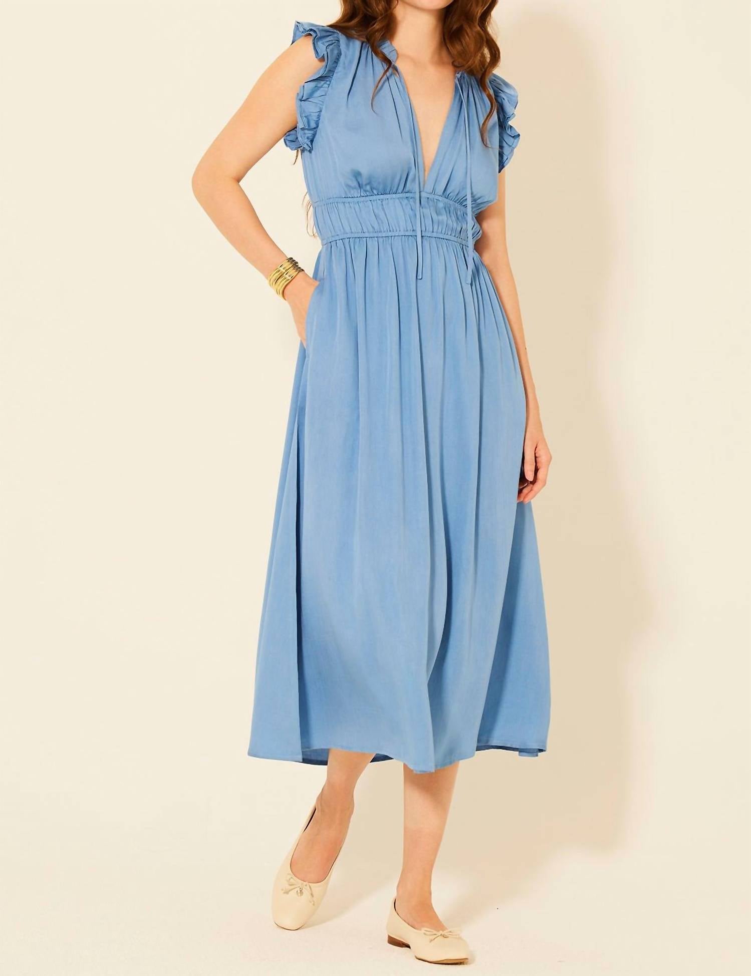 Just add slides or mules and you are good to go. Introducing the Paseo De Oro Midi Dress by BILA77, an elegant choice for any evening event. This Coastal Blue A-line dress embodies quiet luxury with its solid pattern and V-neck design, featuring cap sleeves and convenient pockets. Made from 100% Rayon, it offers a pull-on closure for effortless wear. Care instructions include hand wash and lay flat to dry.