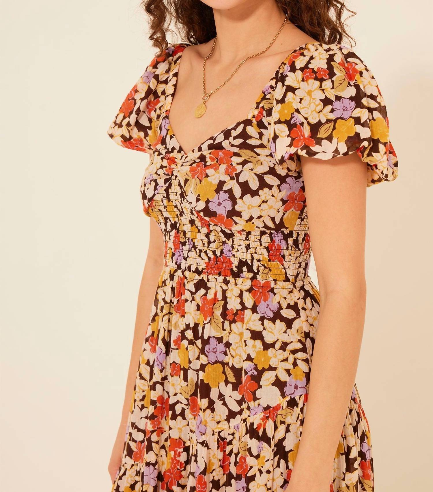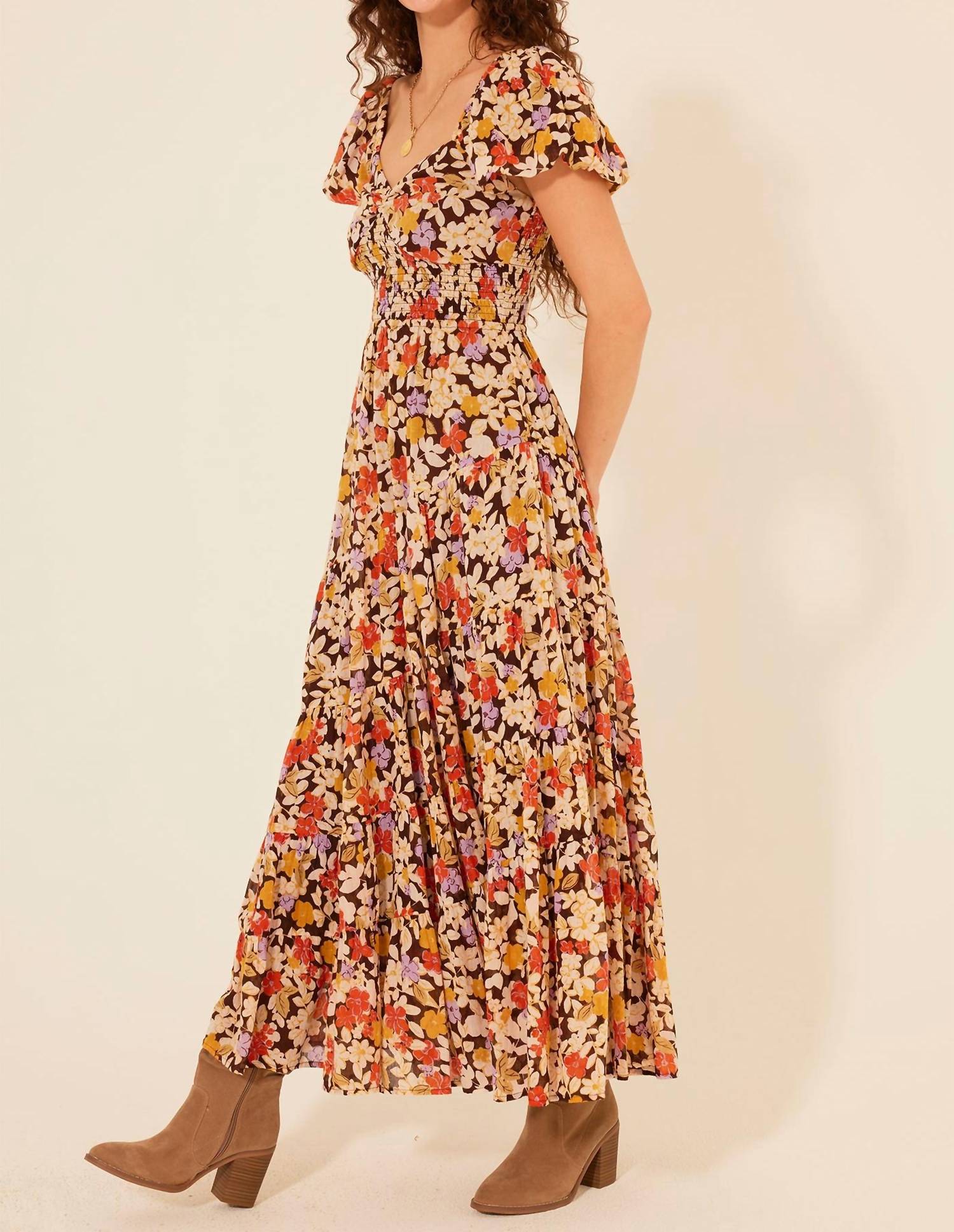 Embrace fall fashion with the Roxanne Floral Maxi Dress by BILA77, designed in a chic cream and brown color palette. This dress features short sleeves and a flattering smocked waistband, exuding a boho chic vibe with its floral pattern and A-line silhouette. Made from 100% cotton gauze and crafted under fair working conditions in India, it offers comfort and style for any occasion. Closure: Pull on. Care: Hand wash and line dry. M