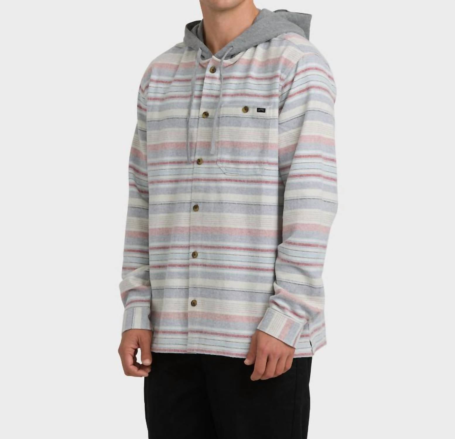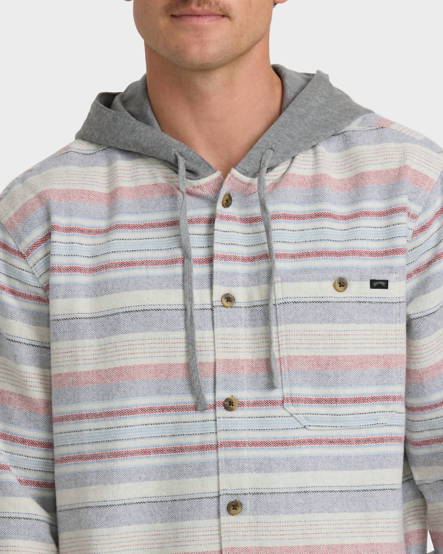 Introducing the Baja Flannel Sweatshirt by Billabong, a stylish slate blue men's sweatshirt that combines comfort and rugged charm. This piece showcases long sleeves and an adjustable hood with fleece lining, crafted from 85% cotton and 15% polyester for a soft and durable feel. The classic yarn-dyed flannel pattern and a practical single chest pocket with a button enhance its functionality, while the straight hem with side vents ensures a relaxed fit.