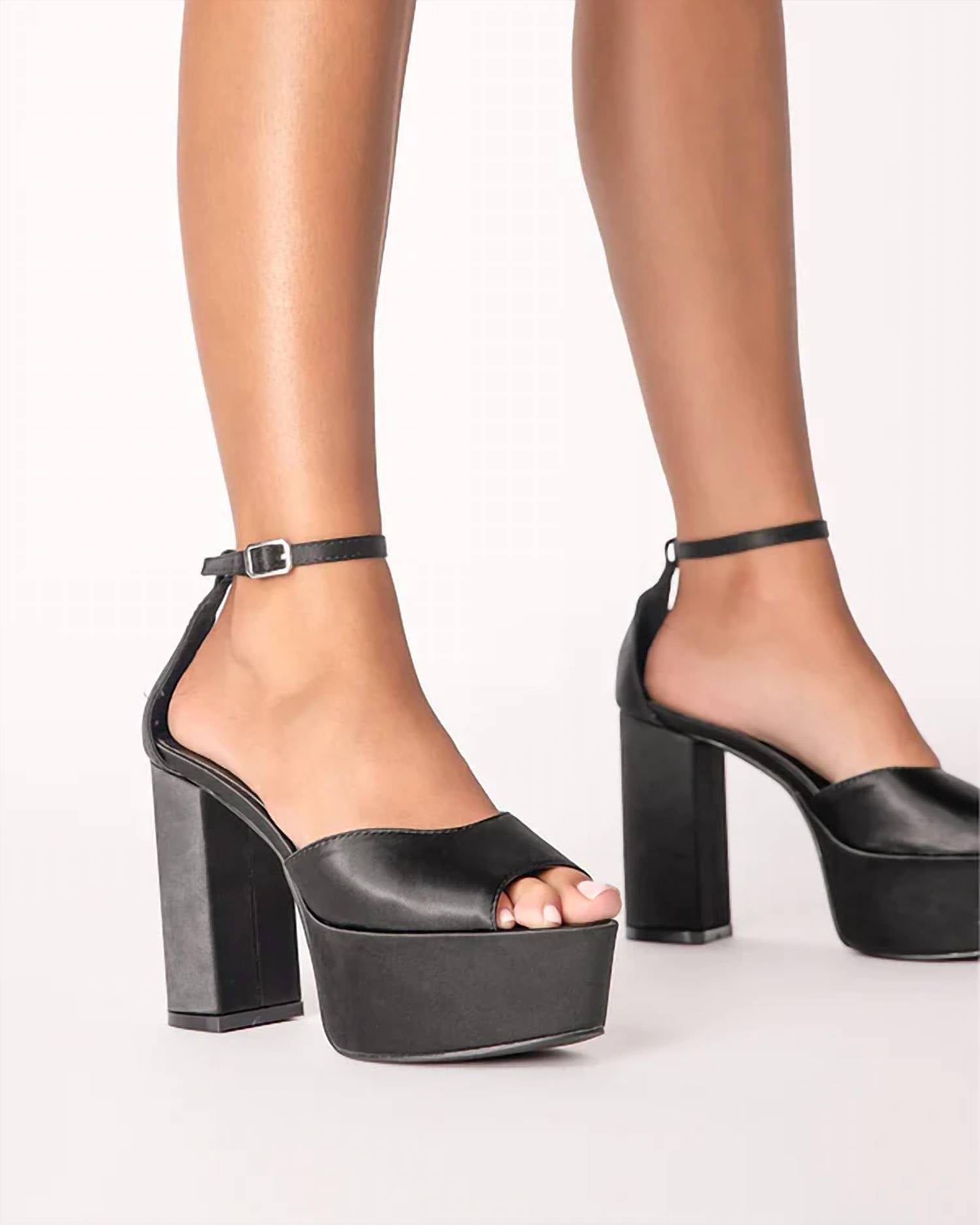 Don't be deceived, these heels are comfy as can be. Step out in style with the Romara Platform Heels by BiLLiNi, a bold choice in Black Satin for any occasion. These high heels feature a 4.3-inch platform block heel, complemented by an open round peep toe and a wide strap across the vamp for a chic look. An adjustable buckle fastening with wrap-around ankle strap ensures a secure fit, while the closed heel counter provides stability. Crafted with a synthetic upper, lining, and outsole, these heels are a stunning addition to any wardrobe.