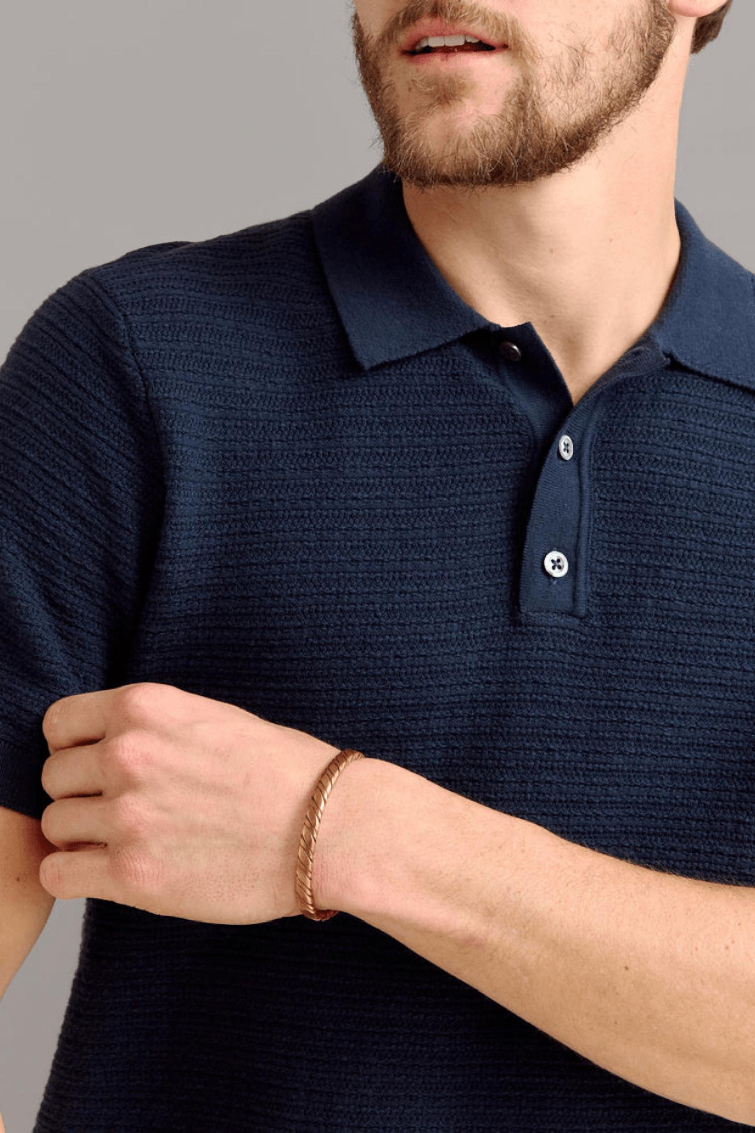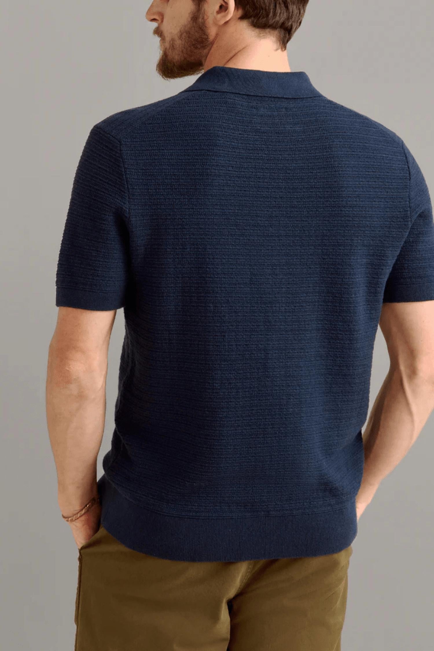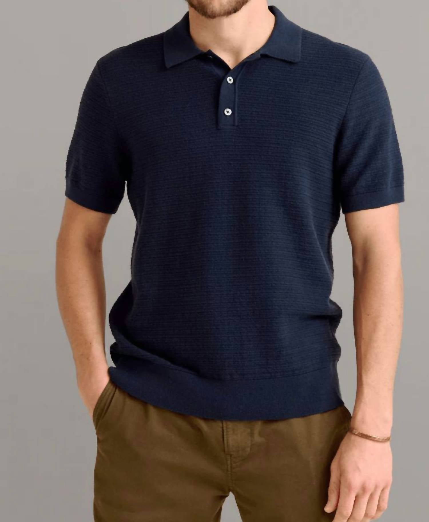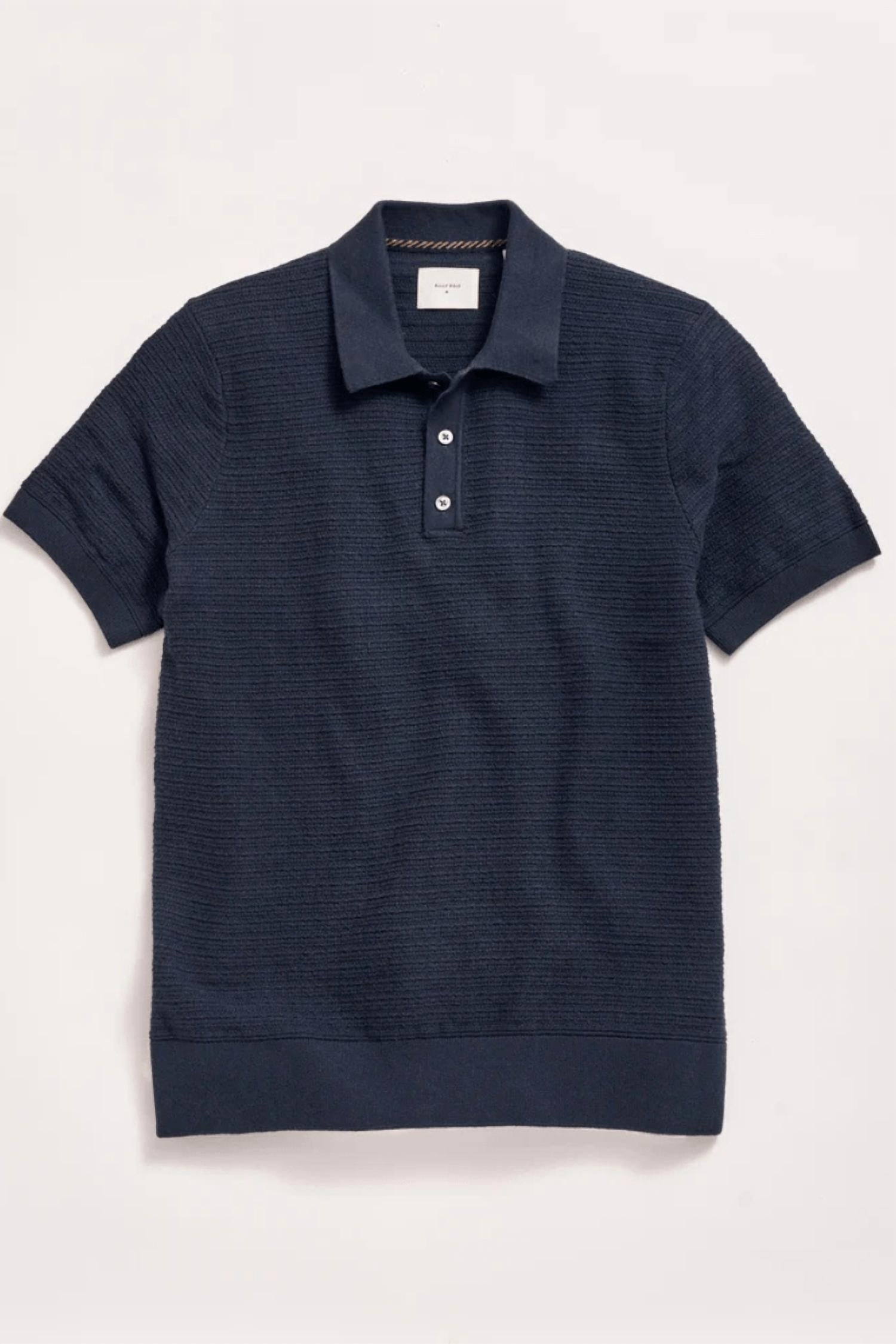Discover the Billy Reid Lachlan Links Polo in an elegant carbon blue, inspired by vintage golf style with a modern twist. This short sleeve shirt is crafted from 100% cotton, offering breathability and comfort for spring days. The polo features a classic collar paired with smoke trochus buttons for a sophisticated look. Easy to care for, it is machine washable and perfect for occasions from Easter gatherings to country club outings.
