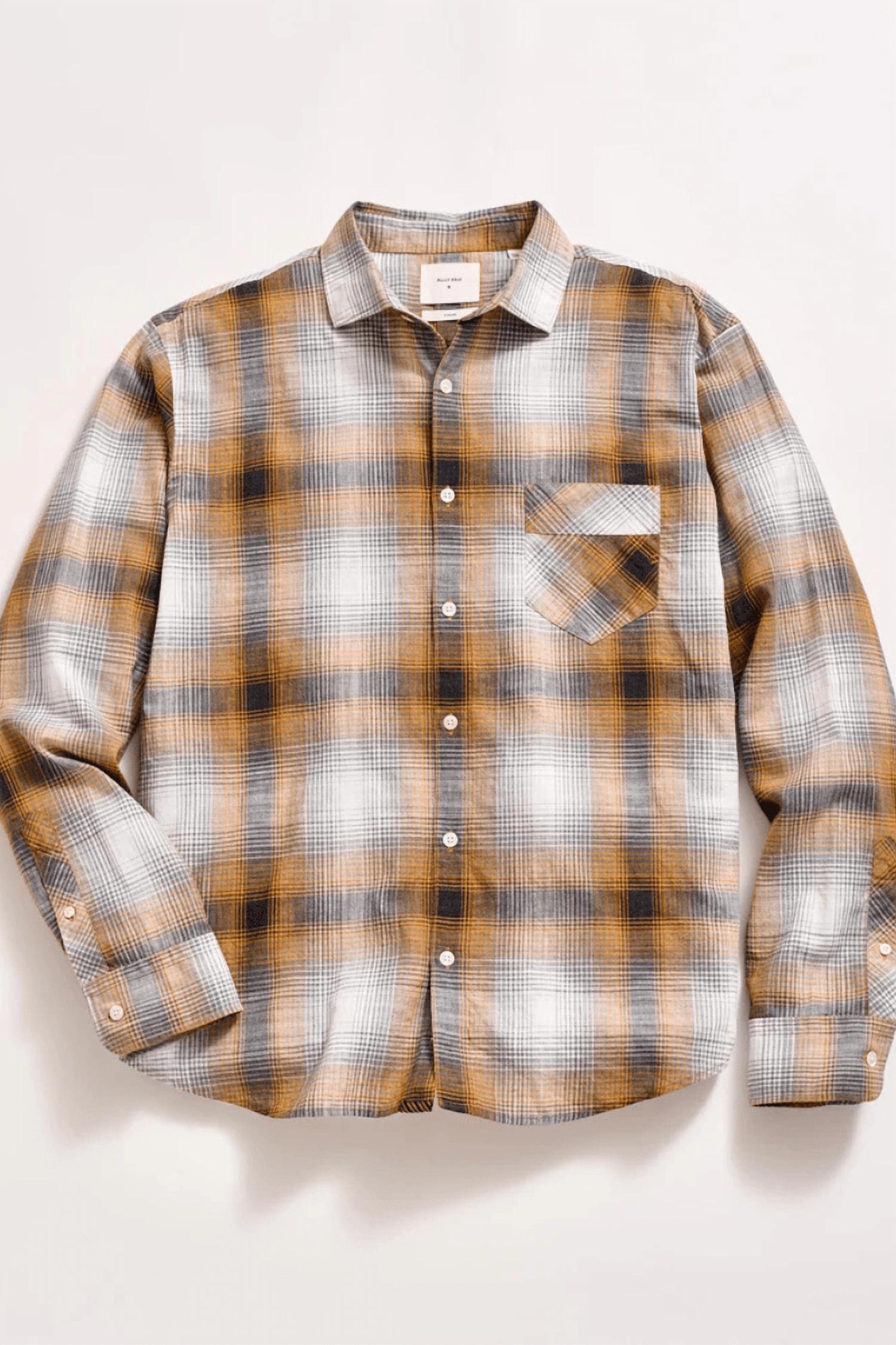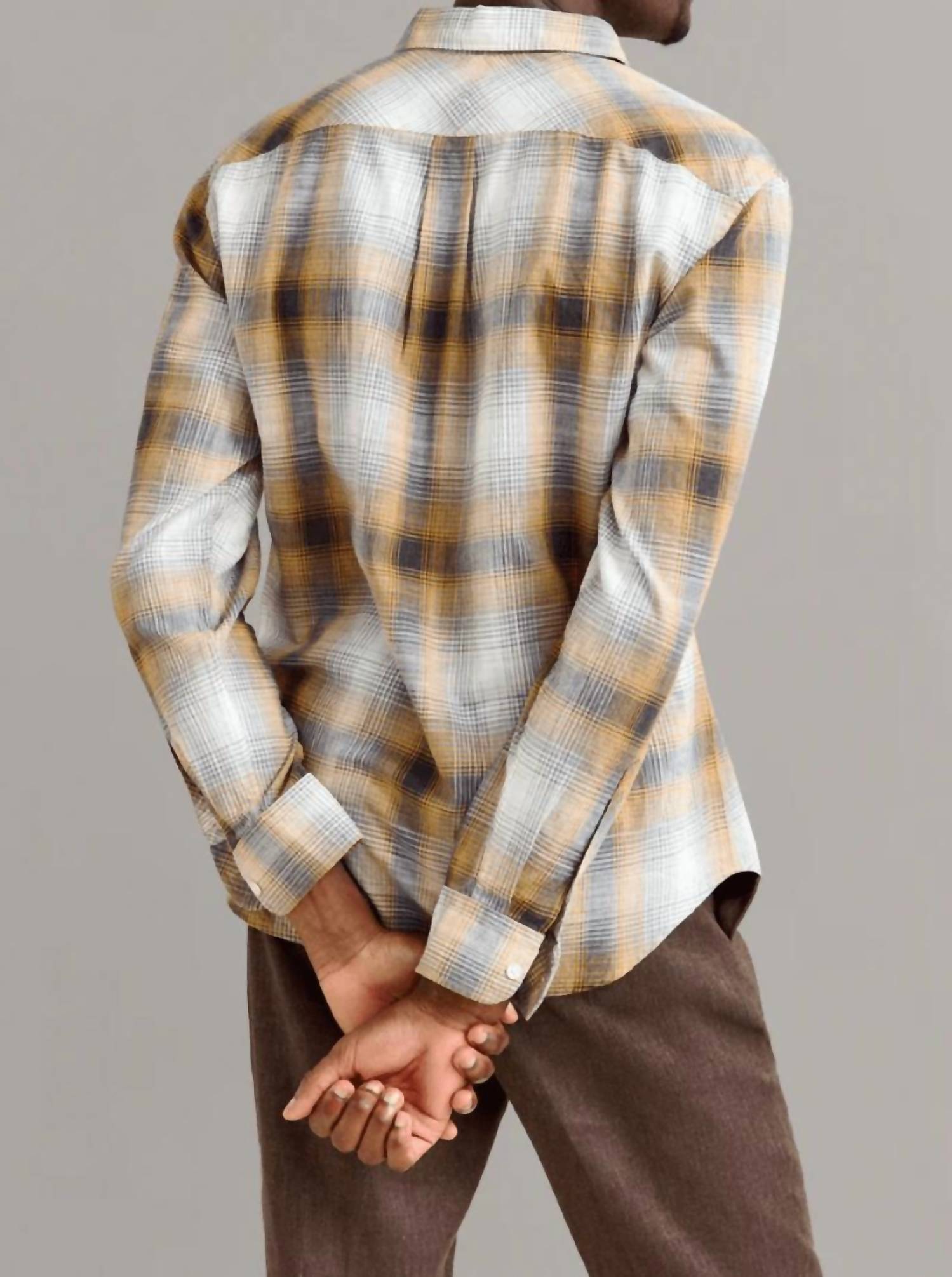 The Melange Shadow Plaid John T Shirt by Billy Reid is the epitome of quiet luxury, crafted in a unique honey multi plaid pattern exclusive to the brand. It features a straight collar, short sleeves, and a signature spade pocket for a classic look that is both stylish and functional. Made from cotton, this button-closure shirt transitions seamlessly from casual weekends to a dinner party ensemble. Origin: Not specified. Care: Machine wash.