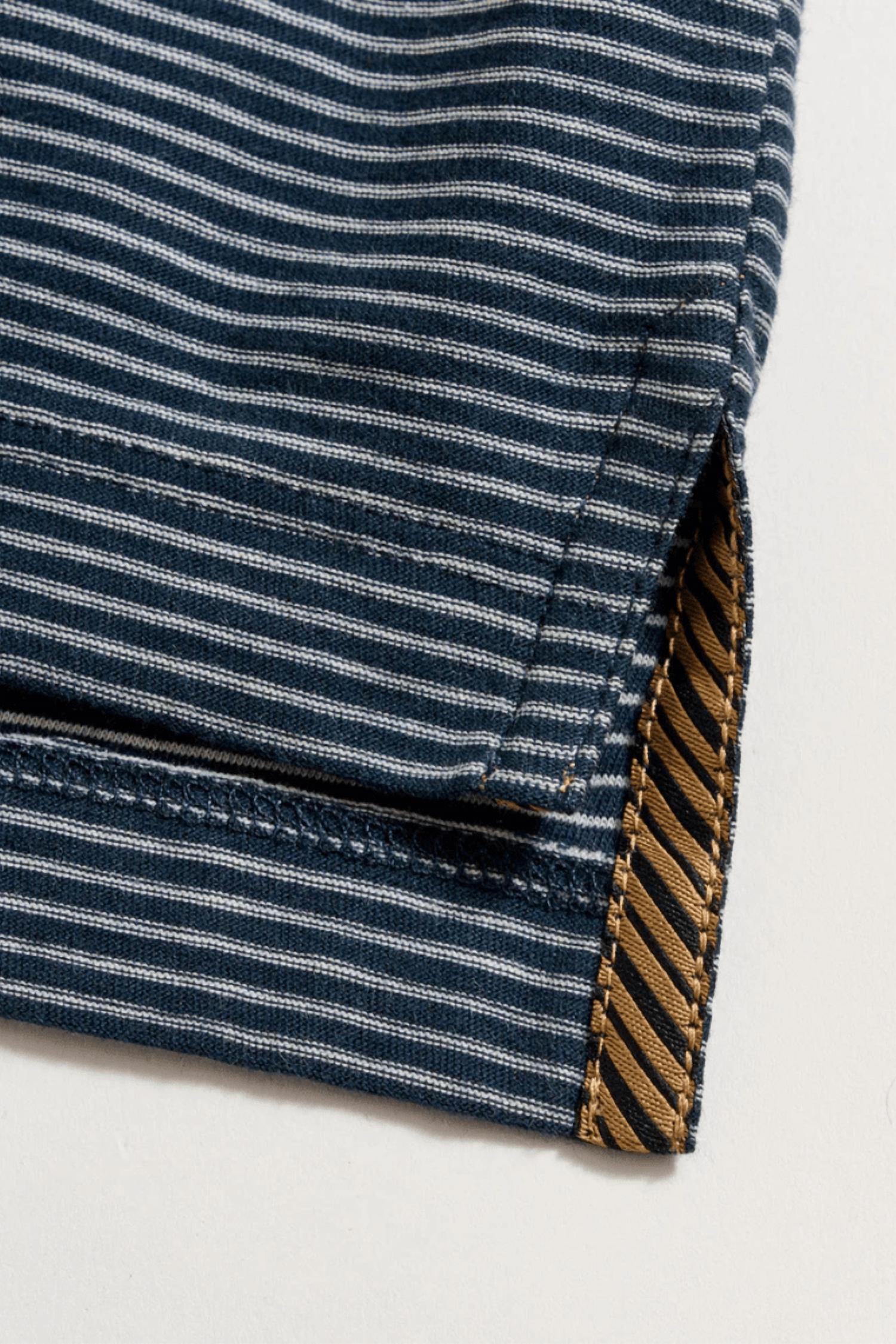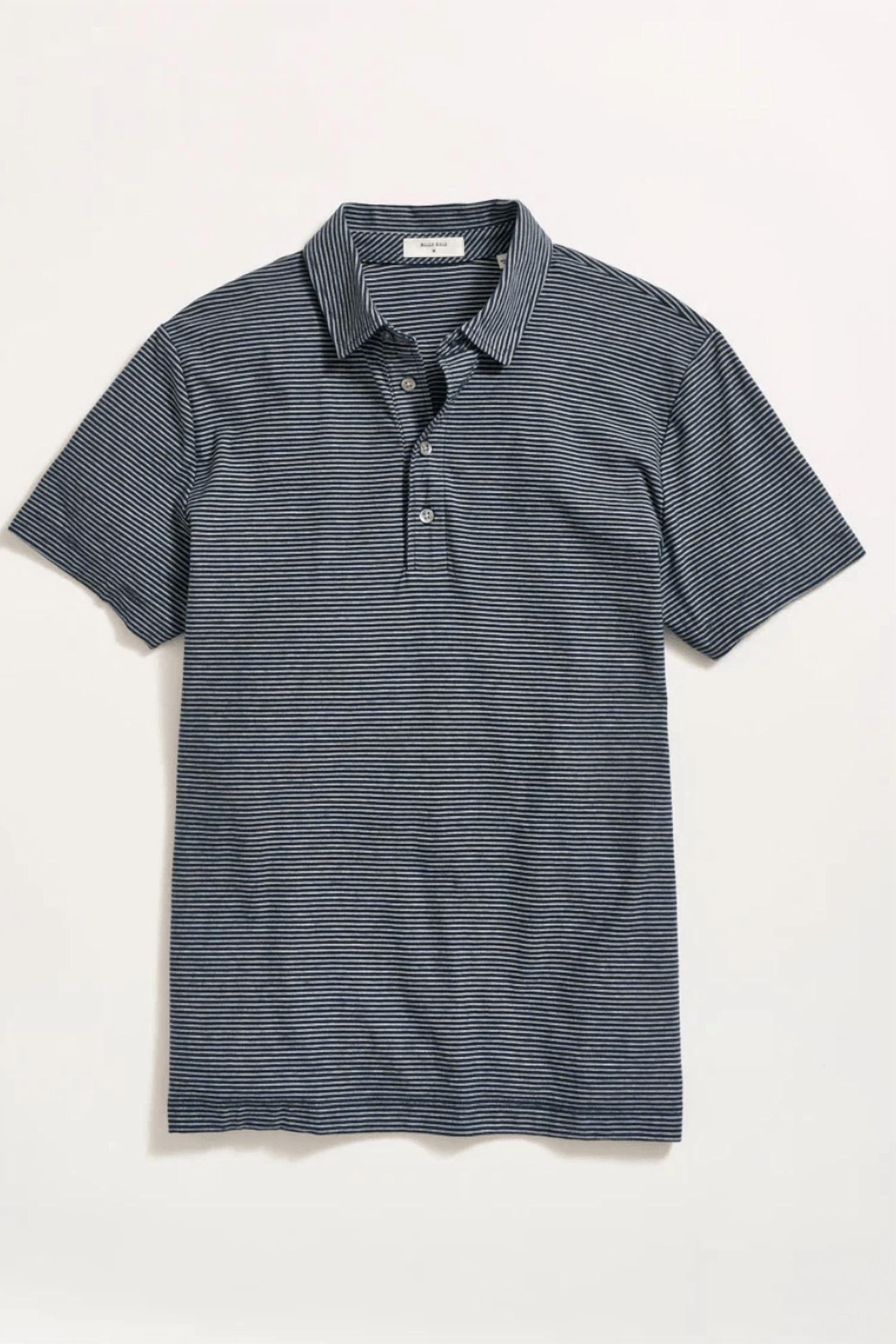 Introducing Billy Reid's Men's Stripe Pensacola Polo Shirt in classic Carbon Blue/Silver, perfect for a minimalist spring wardrobe. This polo features short sleeves and a no-flop collar, crafted from 100% organic cotton for comfort and breathability. Made in Peru, it boasts a clean front with no pockets and a button closure. Care is easy with machine wash cold on a delicate cycle; simply turn inside out and tumble dry low or hang to dry.
